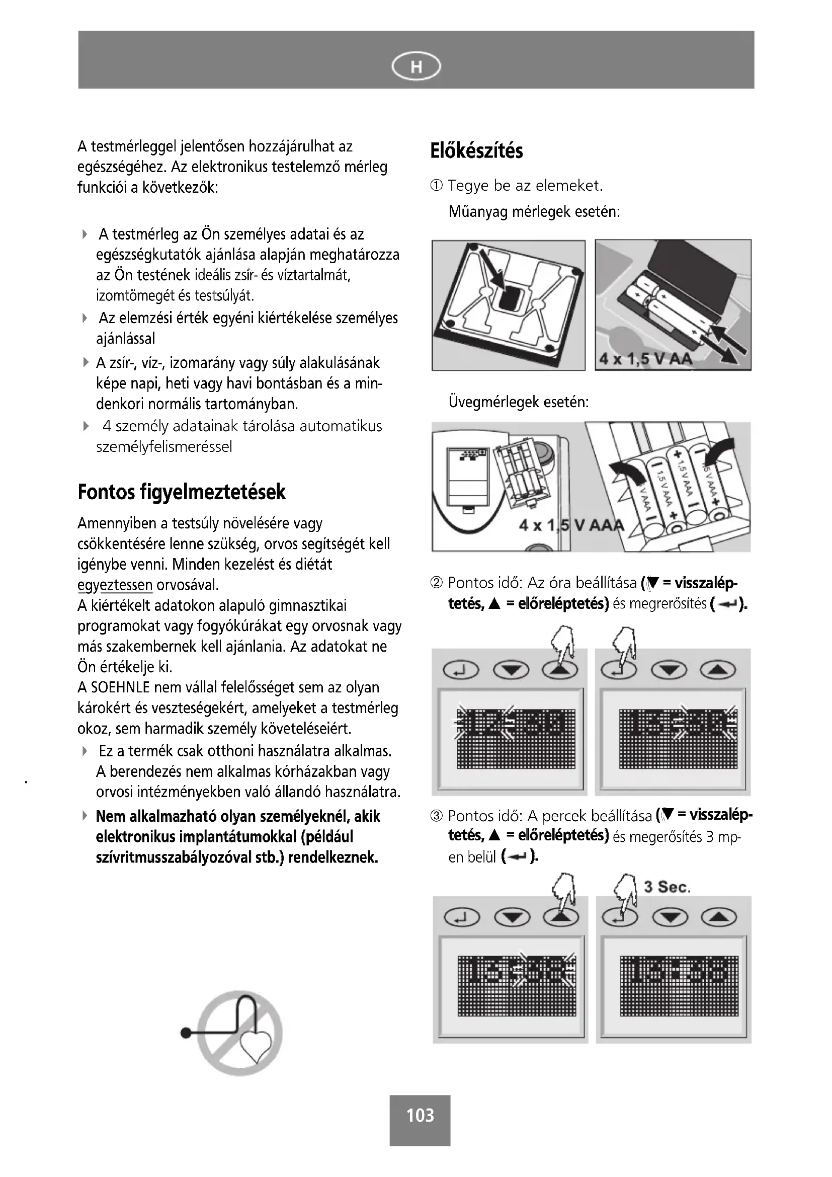 NNeemm aallkkaallmmaazzhhaattóó oollyyaann sszzeemmééllyyeekknnééll,, aakkiikk eelleekkttrroonniikkuuss iimmppllaannttááttuummookkkkaall ((ppééllddááuull sszzíívvrriittmmuusssszzaabbáállyyoozzóóvvaall ssttbb..)) rreennddeellkkeezznneekk.. EEllőőkkéésszzííttééss ➀ Tegye be az elemeket. Műanyag mérlegek esetén: Üvegmérlegek esetén: ➁ Pontos idő: Az óra beállítása