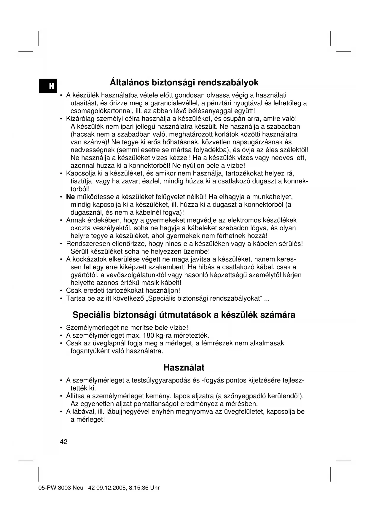 - Ha a kijelzőn „Err“ (Error = hiba) jelenik meg, akkor a mérendő súly meghalad- ja a 180 kg-ot. 05-PW 3003 Neu 43 09.12.2005, 8:15:36 UhrH