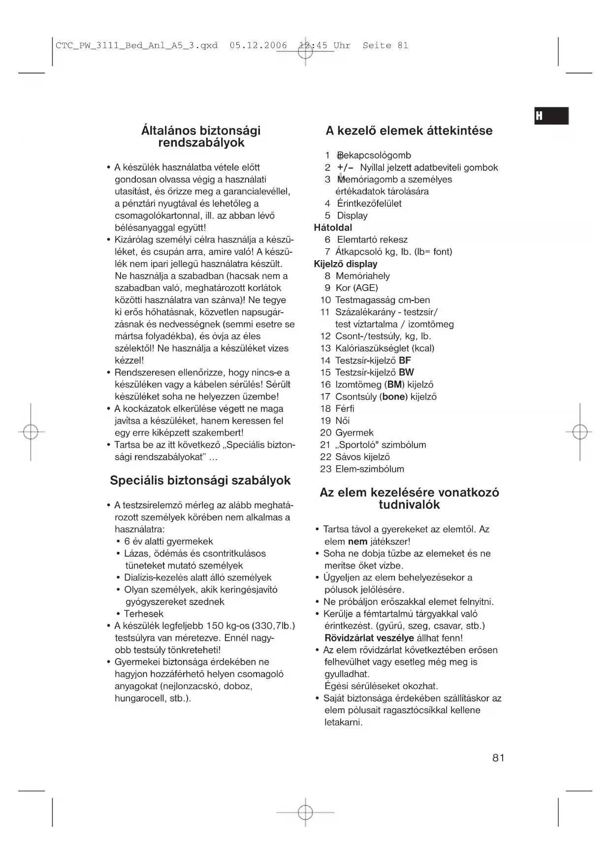 CTC_PW_3111_Bed_Anl_A5_3.qxd 05.12.2006 12:45 Uhr Seite 81• Ha kifolyik az elem, a folyadékot ne dőrzsőlje szembe vagy nyálkahártyára. Ha hozzáért, mossa meg a kezét, szemét őblítse le hideg vízzel és forduljon orvoshoz, ha panaszai nem múlnak el.