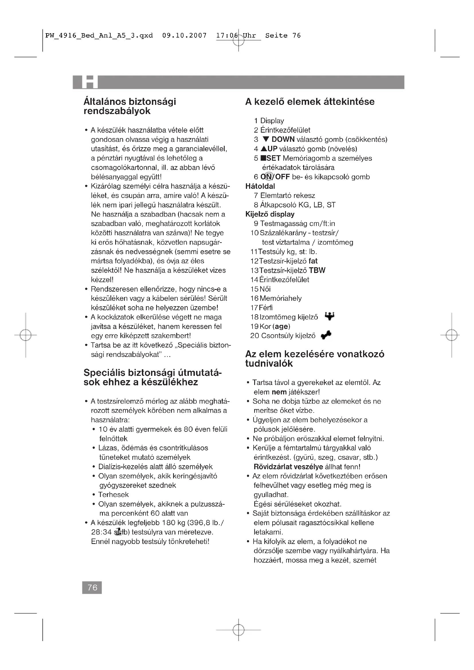 keszt (7). 2.Helyezzen be 3 db 1,5 V-os AM4 „AAA", típusú elemet! Ügyeljen a helyes polaritásra (lásd az elem- tartó rekesz fenekén)! 3.Csukja vissza az elemtartó rekeszt! 4.Ha hosszabb időn át nem használja a kés- züléket, vegye ki belőle az elemet, nehogy „kifusson" az akkumulátorsav! 5.Eltérő elemtípusokat vagy új és használt elemeket nem szabad egyszerre használni. 6.Ha használat közben a kijelzőn (1) megje- lenik az elemkimerülést jelző „LO" jelzés, cserélje ki az elemeket! Tájékoztató a testzsírarány- mérésről Olyan személyeknek, akik szívritmus-szabá- lyozót vagy más, elektronikus alkatrészekkel működő orvosi implantátumot használnak, nem tanácsoljuk ennek a mérlegnek a hasz- nálatát. Veszélyeztetheti, ill. ronthatja ugyanis az implantátum teljesítményét. A készülék csak akkor működik korrektül, ha mezitláb és száraz lábbal állnak az érintkezőfelületre! A készülék működési elve a test elektromos impedanciájának mérésén alapszik. Ehhez a készülék gyenge, nem érezhető elektromos jelet áramoltat végig a mérleget használó sze- mély testén, hogy ennek segítségével megál- lapítsa a test aktuális értékeit. E jel általános teljesen ártalmatlan! Ennek ellenére kérjük, hogy olvassa át speciális biztonsági rendsza- bályainkat! A mérés a „bioelektromos impe- danciaelemzés" fogalma körében ismeretes. Ez egy olyan tényező, amely összefügg a testzsír- és testvízrészaránnyal, és kapcsolat- ban van egyéb élettani adatokkal (életkor, nem, testmagasság).Vannak emberek, akik testének zsír- és izomaránya kiegyenlített, és vannak látszólag karcsú emberek, akiknek testzsíraránya jócskán meghaladja az átlago- sat. A zsír olyan tényező, amely jelentősen hozzájárul a szervezet, különösen a szív és a keringési rendszer terheléséhez. E két érték ellenőrzése (a zsíré és a testsúlyé) ezért az egészség és fi ttség alapvető feltétele. Testzsír A test zsíraránya a szervezet fontos alkotóele- me. A zsír fontos feladatokat lát el a testben az ízületek védelmétől kezdve a vitaminok tárolásán keresztül egészen a testhő szabá- lyozásáig. Nem az tehát a cél, hogy radikáli- san csökkentsük a zsírarányt, hanem hogy kiegyenlített arányt értjünk el és tartsunk fenn az izomtömeg és a zsírtömeg között. Figyelem! Az elemek nem tartoznak a háztartási sze- méthez. Kérjük, hogy a használt elemeket adja le az illetékes gyűjtőhelyeken vagy a szaküzletben! Figyelmeztetés! Az elemeket ne tegye ki magas hőmérsékletnek vagy közvetlen napsugár- zásnak! Soha ne dobja az elemeket a tűzbe! Robbanásveszély áll fenn! PW_4916_Bed_Anl_A5_3.qxd 09.10.2007 17:06 Uhr Seite 7778