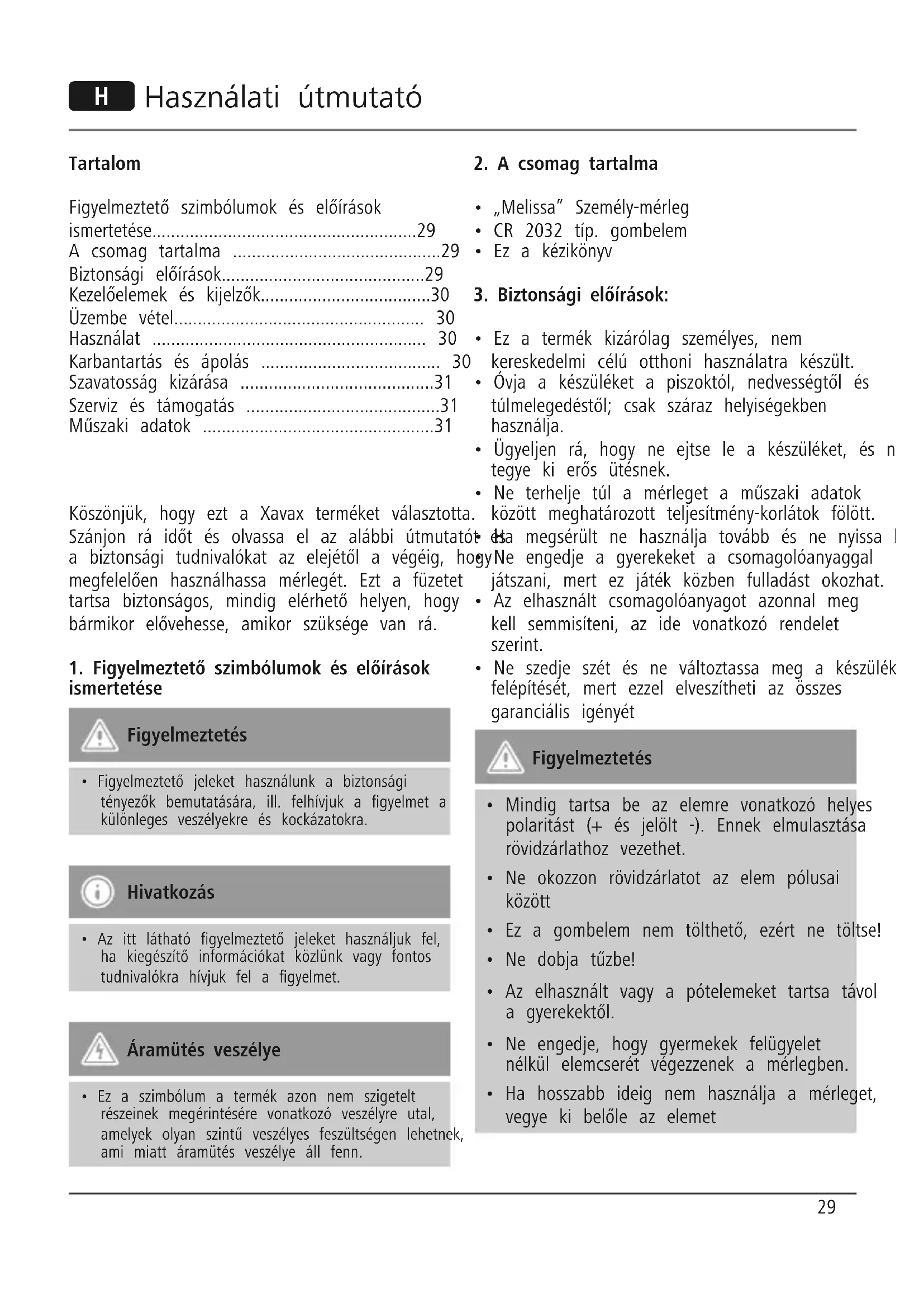 - Műszaki adatok Köszönjük, hogy ezt a Xavax terméket választotta. Szánjon rá időt és olvassa el az alábbi útmutatót és a biztonsági tudnivalókat az elejétől a végéig, hogy megfelelően használhassa mérlegét. Ezt a füzetet tartsa biztonságos, mindig elérhető helyen, hogy bármikor elővehesse, amikor szüksége van rá. p. 31