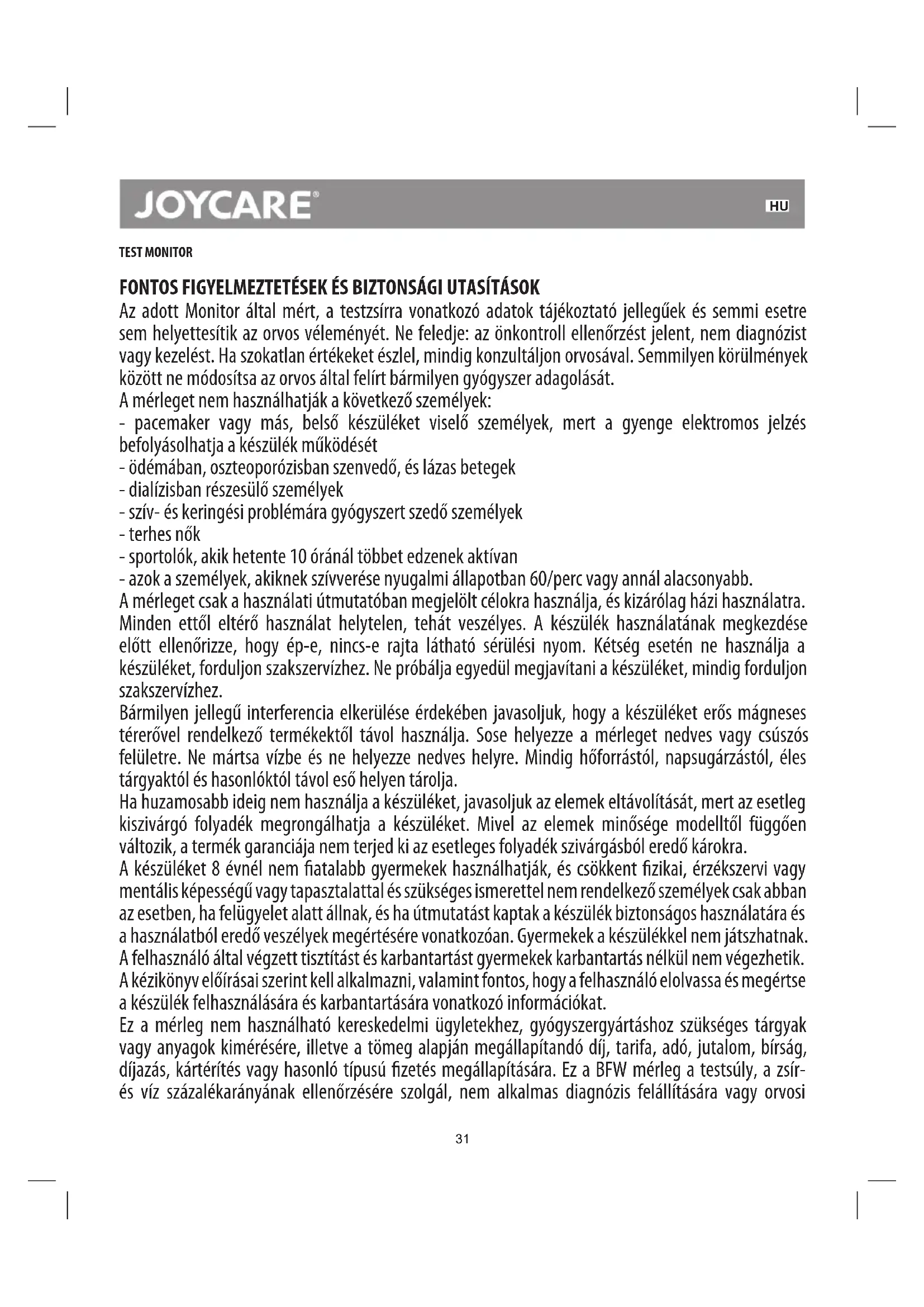 TEST MONITOR FONTOS FIGYELMEZTETÉSEK ÉS BIZTONSÁGI UTASÍTÁSOK Az adott Monitor által mért, a testzsírra vonatkozó adatok tájékoztató jellegűek és semmi esetre sem helyettesítik az orvos véleményét. Ne feledje: az önkontroll ellenőrzést jelent, nem diagnózist vagy kezelést. Ha szokatlan értékeket észlel, mindig konzultáljon orvosával. Semmilyen körülmények között ne módosítsa az orvos által felírt bármilyen gyógyszer adagolását. A mérleget nem használhatják a következő személyek: - pacemaker vagy más, belső készüléket viselő személyek, mert a gyenge elektromos jelzés befolyásolhatja a készülék működését - ödémában, oszteoporózisban szenvedő, és lázas betegek - dialízisban részesülő személyek - szív- és keringési problémára gyógyszert szedő személyek - terhes nők - sportolók, akik hetente 10 óránál többet edzenek aktívan - azok a személyek, akiknek szívverése nyugalmi állapotban 60/perc vagy annál alacsonyabb. A mérleget csak a használati útmutatóban megjelölt célokra használja, és kizárólag házi használatra. Minden ettől eltérő használat helytelen, tehát veszélyes. A készülék használatának megkezdése előtt ellenőrizze, hogy ép-e, nincs-e rajta látható sérülési nyom. Kétség esetén ne használja a készüléket, forduljon szakszervízhez. Ne próbálja egyedül megjavítani a készüléket, mindig forduljon szakszervízhez. Bármilyen jellegű interferencia elkerülése érdekében javasoljuk, hogy a készüléket erős mágneses térerővel rendelkező termékektől távol használja. Sose helyezze a mérleget nedves vagy csúszós felületre. Ne mártsa vízbe és ne helyezze nedves helyre. Mindig hőforrástól, napsugárzástól, éles tárgyaktól és hasonlóktól távol eső helyen tárolja. Ha huzamosabb ideig nem használja a készüléket, javasoljuk az elemek eltávolítását, mert az esetleg kiszivárgó folyadék megrongálhatja a készüléket. Mivel az elemek minősége modelltől függően változik, a termék garanciája nem terjed ki az esetleges folyadék szivárgásból eredő károkra. A készüléket 8 évnél nem atalabb gyermekek használhatják, és csökkent zikai, érzékszervi vagy mentális képességű vagy tapasztalattal és szükséges ismerettel nem rendelkező személyek csak abban az esetben, ha felügyelet alatt állnak, és ha útmutatást kaptak a készülék biztonságos használatára és a használatból eredő veszélyek megértésére vonatkozóan. Gyermekek a készülékkel nem játszhatnak. A felhasználó által végzett tisztítást és karbantartást gyermekek karbantartás nélkül nem végezhetik. A kézikönyv előírásai szerint kell alkalmazni, valamint fontos, hogy a felhasználó elolvassa és megértse a készülék felhasználására és karbantartására vonatkozó információkat. Ez a mérleg nem használható kereskedelmi ügyletekhez, gyógyszergyártáshoz szükséges tárgyak vagy anyagok kimérésére, illetve a tömeg alapján megállapítandó díj, tarifa, adó, jutalom, bírság, díjazás, kártérítés vagy hasonló típusú zetés megállapítására. Ez a BFW mérleg a testsúly, a zsír- és víz százalékarányának ellenőrzésére szolgál, nem alkalmas diagnózis felállítására vagy orvosi32