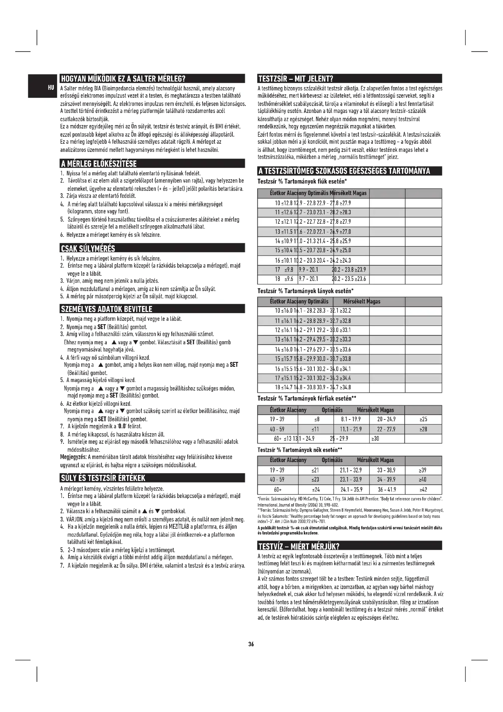 Testvíz táblázat*** TZS % tartomán Optimális össz testvíz % tartomány Férfiak 4 to 14% 70 to 63% 15 to 21% 63 to 57% 22 to 24% 57 to 55% 25 and over 55 to 37% Nők 4 to 20% 70 to 58% 21 to 29% 58 to 52% 30 to 32% 52 to 49% 33 and over 49 to 37% *** Forrás: Levezetve Wang & Deurenberg: “Hydration of fat-free body mass”. American Journal Clin Nutr 1999, 69 8 -841. A testvíz-mérés eredményeit befolyásolja a testzsír és az izom aránya. Ha a testzsír aránya magas vagy az izom aránya alacsony, akkor a testvíz eredményei inkább alacsonyabbak. Fontos észben tartani, hogy a mérések mint pl. a testtömeg, testzsír vagy testvíz mérések eszközöket jelentenek Önnek, amelyeket az egészséges életmód részeként használhat fel. Mivel a rövid ideig tartó ingadozások szokásosnak mondhatók, javasoljuk, hogy a súlya alakulását időben kövesse, és ne csak egy nap mérésére alapozzon. A publikált testvíz %-ok csak útmutatóul szolgálnak. A diéta vagy testedzési program elkezdése előtt mindig ki kell kérni szakorvos tanácsát. MIT JELENT AZ ÉN BMI-ÉRTÉKEM? A testtömeg index (BMI) súly-magasság index, amelyet gyakran használnak a felnőttek alultáplált, túlsúlyos vagy kövér kategóriába történő besorolásához. Ez a mérleg kiszámolja az Ön BMI értékét. Az alábbi ábrán és táblázatban található BMI kategóriákat elismeri a WHO (Egészségügyi Világszervezet), és az Ön BMI értékének értelmezésére használhatók. A BMI kategóriája az alábbi táblázattal azonosítható. BMI kategória: BMI érték értelme Kifejezetten a BMI-re alapuló egészségi kockázat < 18.5 Alultáplált Mérsékelt 18.6-24.9 Normál Alacsony 25-29.9 Túlsúlyos Mérsékelt 30+ Kövér Magas FONTOS: Ha az ábra/táblázat azt mutatja, hogy az Ön súlya kívül esik a „normál” súlytartományom, mielőtt bármit is tenne, forduljon orvoshoz. A BMI osztályozások csak felnőttek számára (több mint 20 év) készültek. ALAP METABOLIKUS RÁTA (BMR) –MIT JELENT? Az alap metabolikus ráta (BMR) a test által nyugalmi állapotban a normális testfunkciók fenntartásához felhasznált, becsült energia (kalóriában mérve). Ez a folyamatos munka kb. 60-70 %-át teszi ki a test által felhasznált kalóriának és magában foglalja a szívműködést, légzést és a testhőmérséklet fenntartását. A BMR-t számos tényező befolyásolja, ezek közé tartozik az életkor, a testtömeg, testmagasság, nem, étkezési és testgyakorlási szokások.Kérdések és válaszok Pontosan hogyan mérik a testzsírt és a testvizet? Ez a Salter mérleg a BIA (Bioelectrical Impedance Analysis – Bioelektromos impedancia elemzés) mérési módszert használja. A mérleg a lábakon és a testen keresztül kis erősségű áramot vezet át. Ez az áram könnyen áthalad a nagyobb nedvességtartalmú zsírmentes izomszöveten, azonban nehezen halad át a zsírszöveten. Ezért a test impedanciájának (vagyis az árammal szembeni ellenállásának) megmérésével meghatározható az izom mennyisége. Ebből megbecsülhető a zsír és víz mennyisége. Méréskor milyen áramerősség halad át rajtam? Biztonságos? Az áramerősség kisebb, mint 1mA, amely nagyon kevés és tökéletesen biztonságos. Nem lehet érzékelni. Kérjük jegyezze meg, hogy ezt az eszközt nem használhatják beépített elektromos orvosi eszközzel, például szívritmus-szabályzóval rendelkező személyek, mert fennáll a beépített orvosi eszköz károsodásának esélye. Ha a testzsír és testvíz százalékot különböző napszakokban mérem, az értékek jelentősen eltérnek. Melyik érték a helyes? A testzsír százalék mérés a test víztartalmának függvényében változik, a test víztartalma pedig a nap folyamán változik.Nincs jó vagy rossz idő a mérés elvégzésére, de törekedjen arra, hogy a méréseket rendszeres időközönként végezze el, amikor úgy véli, hogy teste megfelelően hidratált. Ne végezzen méréseket fürdés vagy szauna után, intenzív edzést után vagy 1-2 órán belül a nagyobb mennyiségű élelmiszer- vagy italfogyasztást követően. Barátomnak egy másik gyártó által gyártott testtömeg analizátora van. Amikor azt használtam, különböző eredményt adott a testzsír mérés. Miért van ez? Különböző testzsír analizátorok a test különböző részeit mérik és különböző matematikai algoritmusokat használnak a testzsír-százalék algoritmus kiszámolásához. A legjobb tanács az, ha nem veti össze a különböző készülékeket, hanem mindig ugyanazt a készüléket használja a változások nyomon követéséhez. Hogyan értelmezzem a testzsír- és a testvíz százalék értéket? Kérjük, tekintse meg a termékhez mellékelt testzsír- és testvízszázalék táblázatot. A táblázat alapján eldöntheti, hogy az Ön testzsír és testvíz százalék értéke (az életkorhoz és a nemhez viszonyítva) az egészséges kategóriába tartozik-e. Mit tegyek, ha a testzsír értékem nagyon „magas”? A megfelelő diéta, folyadékbevitel és edzésprogram csökkenti a testzsír-százalékot. Egy ilyen program elkezdése előtt ki kell kérni szakorvos tanácsát. Miért különbözik ennyire a férfiak és a nők testzsír-százaléka? A nők természetes módon nagyobb mennyiségű zsírral rendelkeznek, mert testfelépítésük különböző. A nagyobb mennyiségű zsír a terhesség, szoptatás stb. során is szükséges. Mit tegyek, ha a testvíz értékem „alacsony”? Gondoskodjon róla, hogy mindig elegendő vizet igyon és dolgozzon azon, hogy zsírszázaléka az egészséges tartományba essen. Miért kerüljem a testzsíranalizátoros mérleg használatát terhesség közben? Terhesség közben a női test összetétele jelentősen megváltozik a fejlődő gyermek táplálása érdekében. Ilyen körülmények mellett a testzsír-százalék értékek pontatla