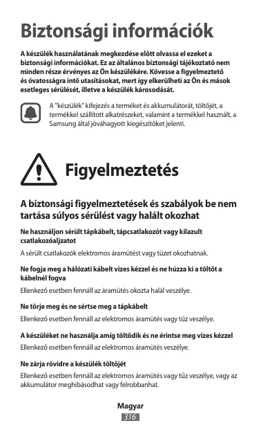 Biztonsági információk A készülék használatának megkezdése előtt olvassa el ezeket a biztonsági információkat. Ez az általános biztonsági tájékoztató nem minden része érvényes az Ön készülékére. Kövesse a figyelmeztető és óvatosságra intő utasításokat, mert így elkerülheti az Ön és mások esetleges sérülését, illetve a készülék károsodását. A "készülék" kifejezés a terméket és akkumulátorát, töltőjét, a termékkel szállított alkatrészeket, valamint a termékkel használt, a Samsung által jóváhagyott kiegészítőket jelenti. Figyelmeztetés A biztonsági figyelmeztetések és szabályok be nem tartása súlyos sérülést vagy halált okozhat Ne használjon sérült tápkábelt, tápcsatlakozót vagy kilazult csatlakozóaljzatot A sérült csatlakozók elektromos áramütést vagy tüzet okozhatnak. Ne fogja meg a hálózati kábelt vizes kézzel és ne húzza ki a töltőt a kábelnél fogva Ellenkező esetben fennáll az áramütés okozta halál veszélye. Ne törje meg és ne sértse meg a tápkábelt Ellenkező esetben fennáll az elektromos áramütés vagy tűz veszélye. A készüléket ne használja amíg töltődik és ne érintse meg vizes kézzel Ellenkező esetben fennáll az elektromos áramütés veszélye. Ne zárja rövidre a készülék töltőjét Ellenkező esetben fennáll az elektromos áramütés vagy tűz veszélye, vagy az akkumulátor meghibásodhat vagy felrobbanhat. Magyar