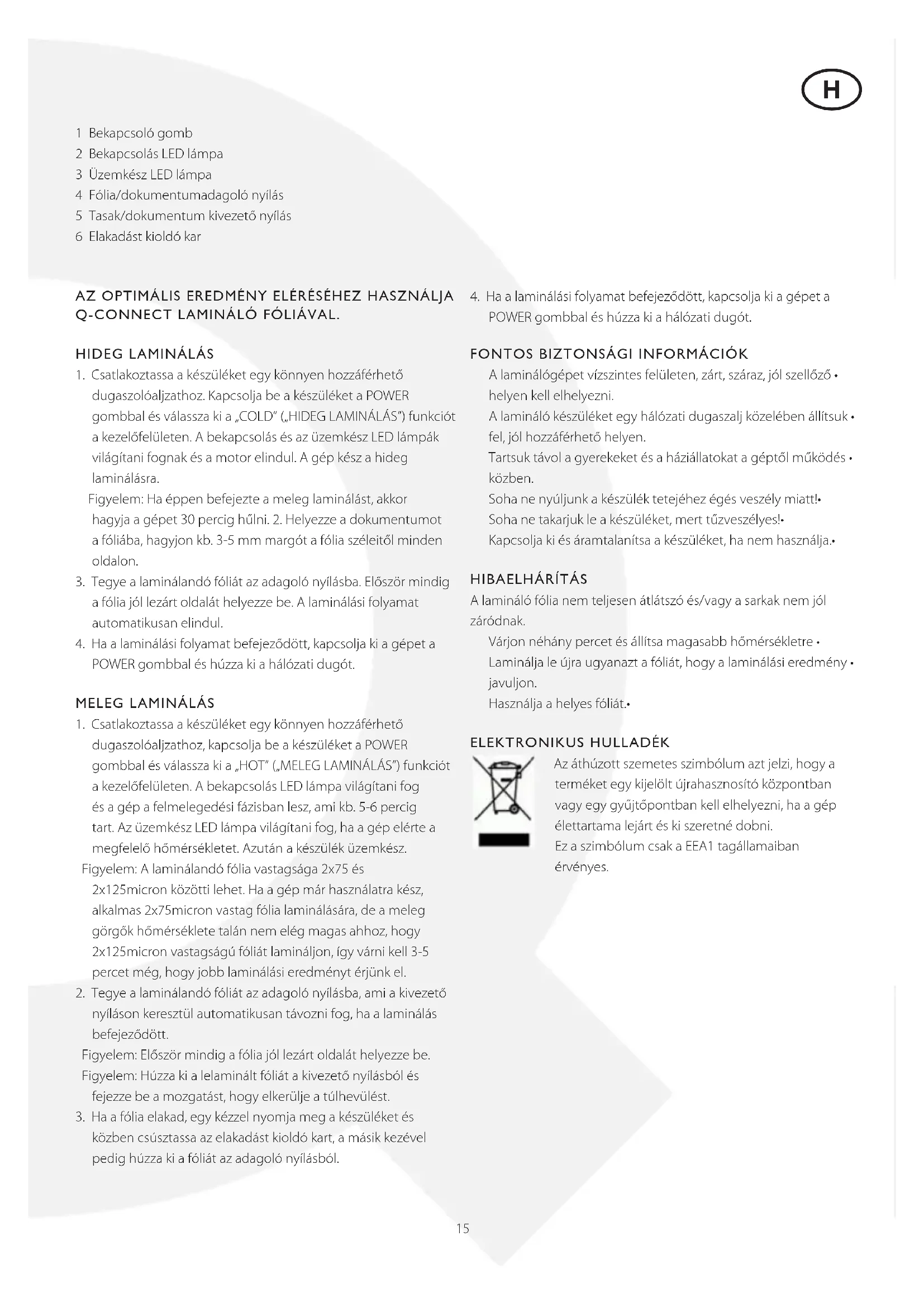 POWER gombbal és húzza ki a hálózati dugót. FONTOS bIzTONSáGI INFORMáCIóK A laminálógépet vízszintes felületen, zárt, száraz, jól szellőző • helyen kell elhelyezni. A lamináló készüléket egy hálózati dugaszalj közelében állítsuk • fel, jól hozzáférhető helyen. Tartsuk távol a gyerekeket és a háziállatokat a géptől működés • közben. Soha ne nyúljunk a készülék tetejéhez égés veszély miatt!• Soha ne takarjuk le a készüléket, mert tűzveszélyes!• Kapcsolja ki és áramtalanítsa a készüléket, ha nem használja.• HIbAeLHáRíTáS A lamináló fólia nem teljesen átlátszó és/vagy a sarkak nem jól záródnak. Várjon néhány percet és állítsa magasabb hőmérsékletre • Laminálja le újra ugyanazt a fóliát, hogy a laminálási eredmény • javuljon. Használja a helyes fóliát.• eLeKTRONIKuS HuLLADéK Az áthúzott szemetes szimbólum azt jelzi, hogy a terméket egy kijelölt újrahasznosító központban vagy egy gyűjtőpontban kell elhelyezni, ha a gép élettartama lejárt és ki szeretné dobni. Ez a szimbólum csak a EEA1 tagállamaiban érvényes. H16 1 Bekapcsoló gomb 2 Bekapcsolás LED lámpa 3 Üzemkész LED lámpa 4 Fólia/dokumentumadagoló nyílás 5 Tasak/dokumentum kivezető nyílás 6 Elakadást kioldó kar HIDeG LAMINáLáS