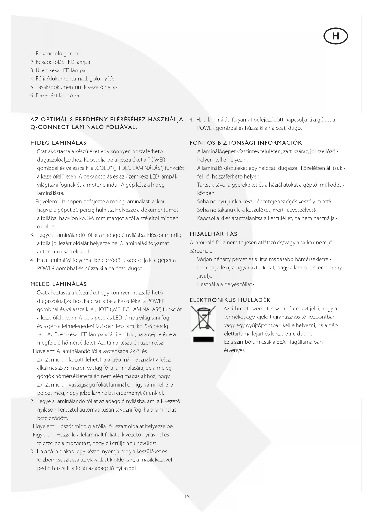 POWER gombbal és húzza ki a hálózati dugót. FONTOS bIzTONSáGI INFORMáCIóK A laminálógépet vízszintes felületen, zárt, száraz, jól szellőző • helyen kell elhelyezni. A lamináló készüléket egy hálózati dugaszalj közelében állítsuk • fel, jól hozzáférhető helyen. Tartsuk távol a gyerekeket és a háziállatokat a géptől működés • közben. Soha ne nyúljunk a készülék tetejéhez égés veszély miatt!• Soha ne takarjuk le a készüléket, mert tűzveszélyes!• Kapcsolja ki és áramtalanítsa a készüléket, ha nem használja.• HIbAeLHáRíTáS A lamináló fólia nem teljesen átlátszó és/vagy a sarkak nem jól záródnak. Várjon néhány percet és állítsa magasabb hőmérsékletre • Laminálja le újra ugyanazt a fóliát, hogy a laminálási eredmény • javuljon. Használja a helyes fóliát.• eLeKTRONIKuS HuLLADéK Az áthúzott szemetes szimbólum azt jelzi, hogy a terméket egy kijelölt újrahasznosító központban vagy egy gyűjtőpontban kell elhelyezni, ha a gép élettartama lejárt és ki szeretné dobni. Ez a szimbólum csak a EEA1 tagállamaiban érvényes. H16 1 Bekapcsoló gomb 2 Bekapcsolás LED lámpa 3 Üzemkész LED lámpa 4 Fólia/dokumentumadagoló nyílás 5 Tasak/dokumentum kivezető nyílás 6 Elakadást kioldó kar HIDeG LAMINáLáS