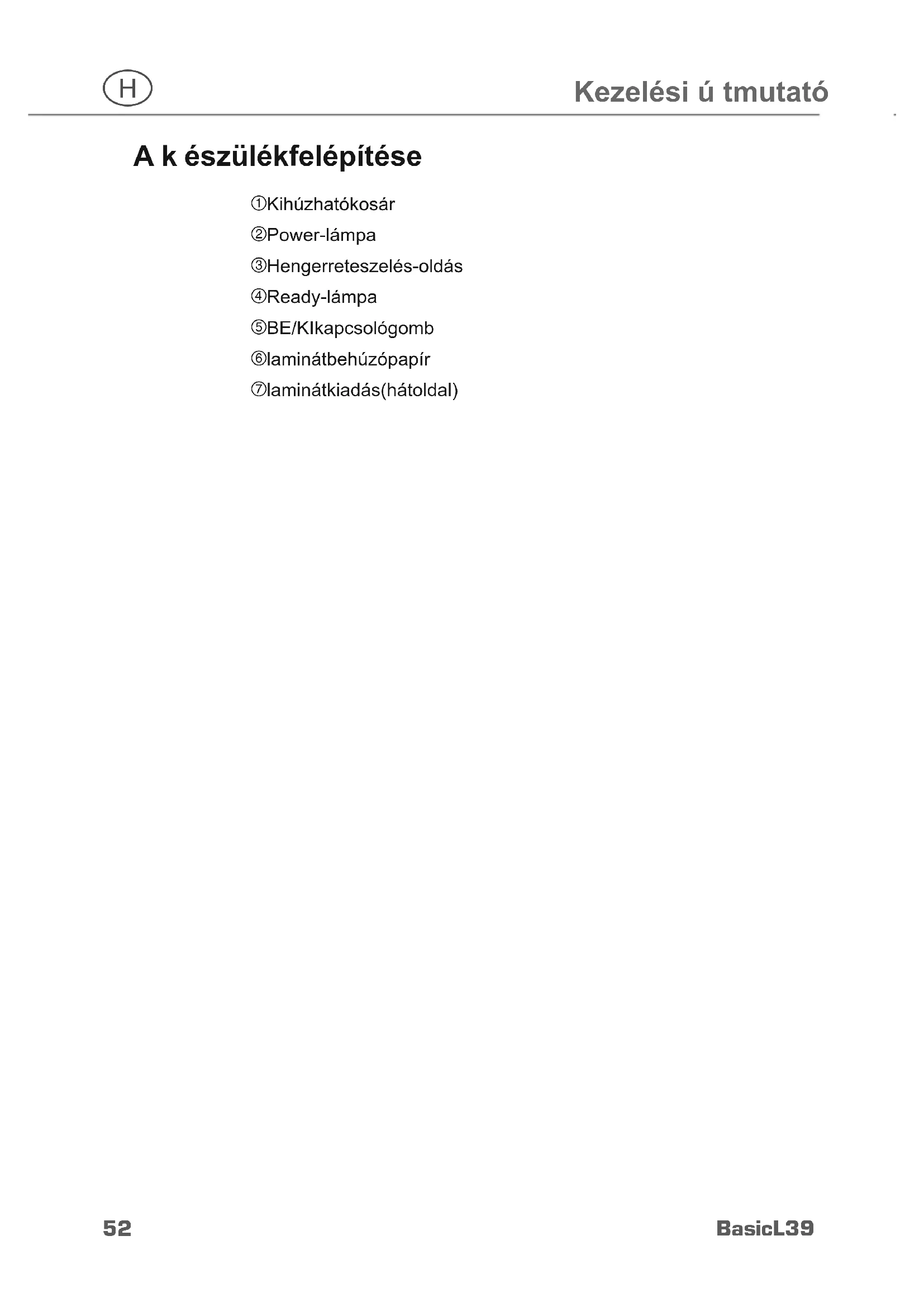 Kezelésiútmutató Akészülék felépítése 1 Kihúzható kosár 2 Power-lámpa 3 Henger reteszelés-oldás 4 Ready-lámpa 5 BE/KI kapcsoló gomb 6 laminátbehúzó papír 7 laminátkiadás (hátoldal)Basic L39