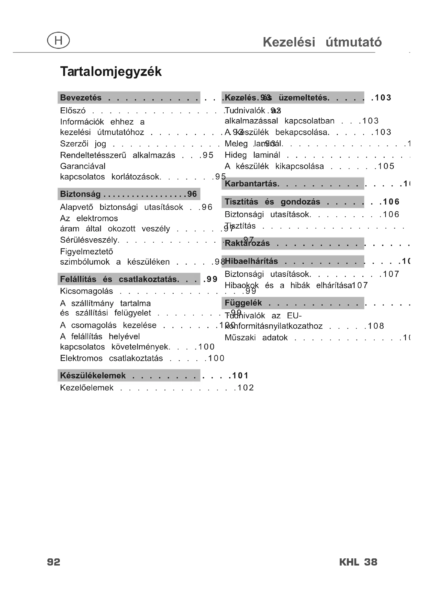 Függelék . . . . . . . . . . . . . . . . . .108 Tudnivalók az EU- konformitásnyilatkozathoz . . . . .108 Műszaki adatok . . . . . . . . . . . . .109 Kezelési útmutatóBevezetés KHL 38