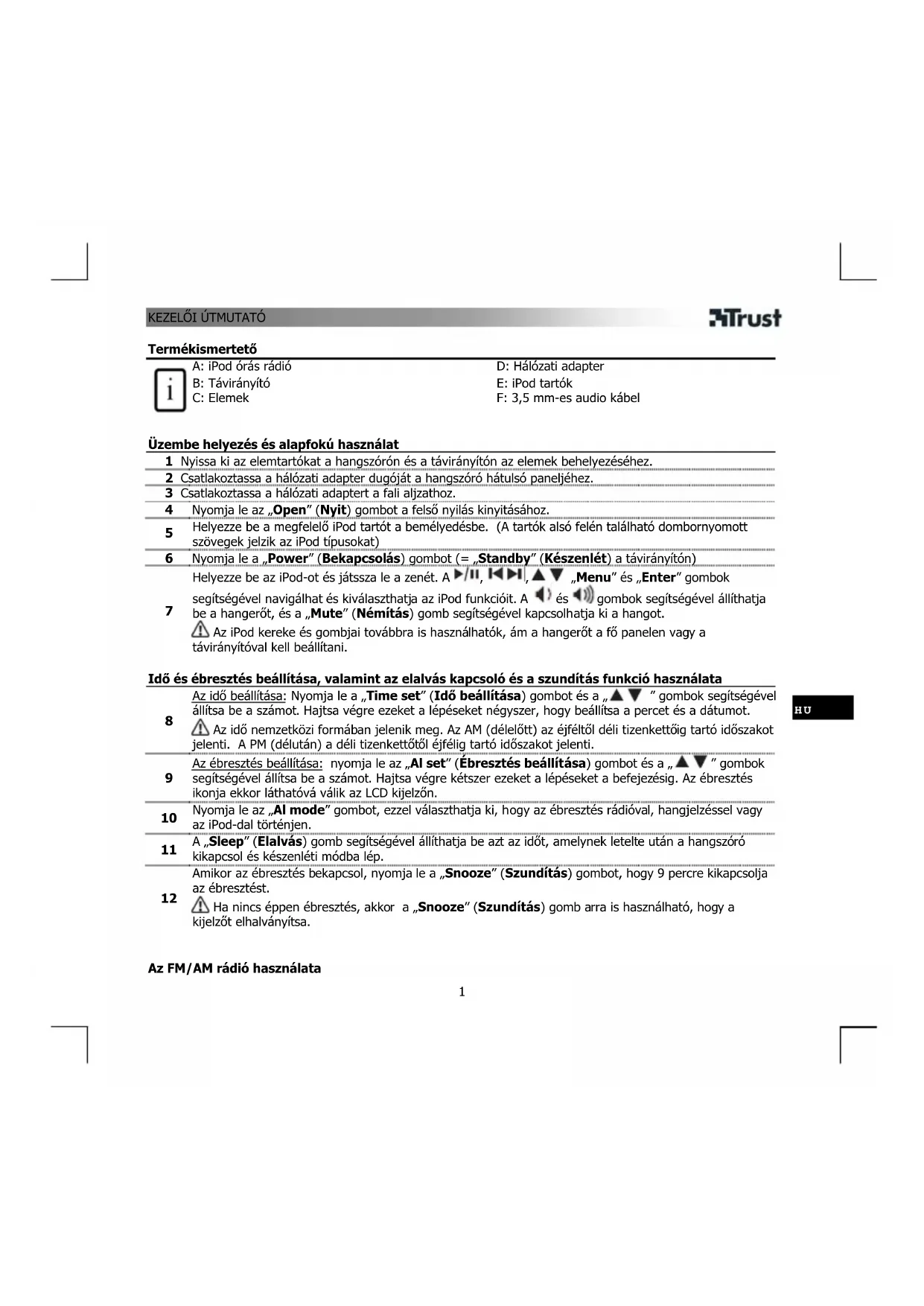 Termékismertető A: iPod órás rádió B: Távirányító C: Elemek D: Hálózati adapter E: iPod tartók F: 3,5 mm-es audio kábel Üzembe helyezés és alapfokú használat 1 Nyissa ki az elemtartókat a hangszórón és a távirányítón az elemek behelyezéséhez. 2 Csatlakoztassa a hálózati adapter dugóját a hangszóró hátulsó paneljéhez. 3 Csatlakoztassa a hálózati adaptert a fali aljzathoz. 4 Nyomja le az „Open” (Nyit) gombot a felső nyilás kinyitásához.