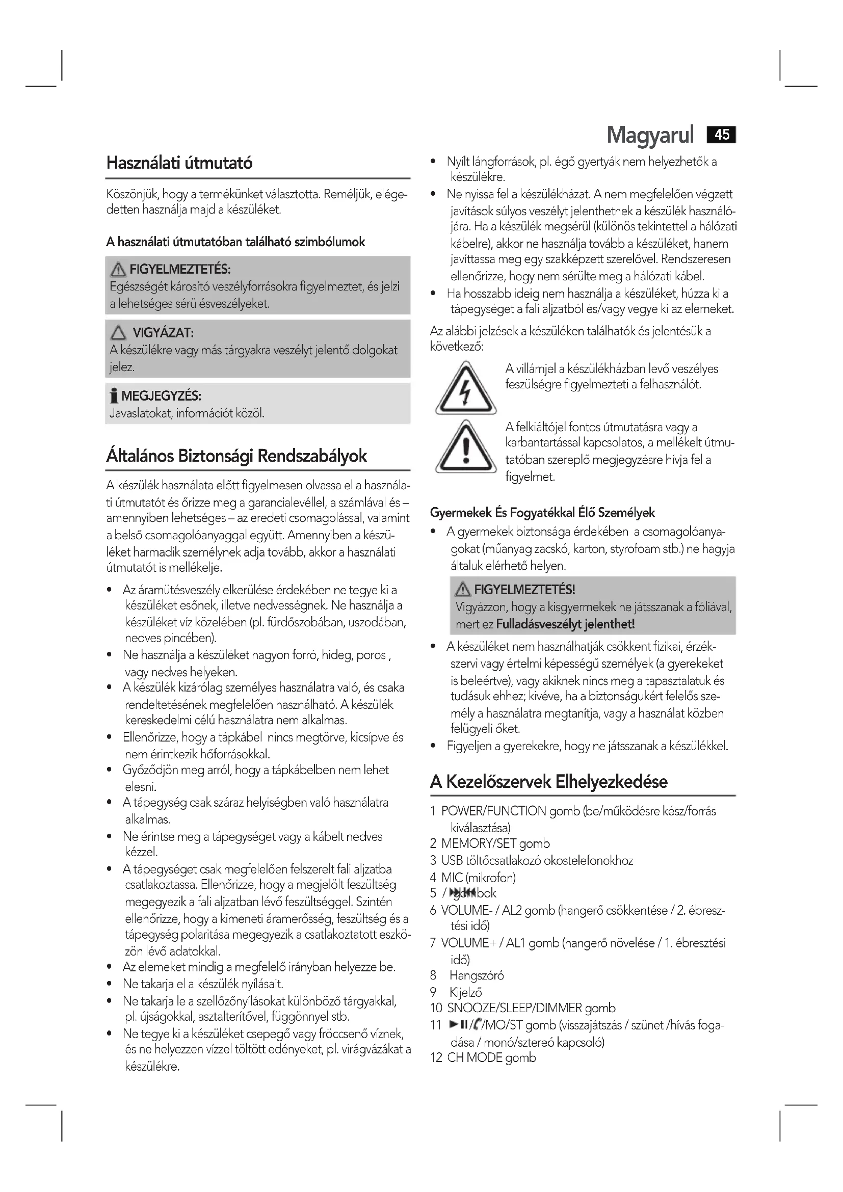 - Figyeljenagyerekekre,hogynejátsszanakakészülékkel. A Kezelőszervek Elhelyezkedése 1 POWER/FUNCTION gomb (be/működésre kész/forrás kiválasztása) 2 MEMORY/SET gomb 3 USB töltőcsatlakozó okostelefonokhoz 4 MIC (mikrofon) 5 / gombok 6 VOLUME- / AL2 gomb (hangerő csökkentése / 2. ébresz- tési idő) 7 VOLUME+ / AL1 gomb (hangerő növelése / 1. ébresztési idő) 8 Hangszóró 9 Kijelző 10 SNOOZE/SLEEP/DIMMER gomb 11 / /MO/ST gomb (visszajátszás / szünet /hívás foga- dása / monó/sztereó kapcsoló) 12 CH MODE gombMagyarul