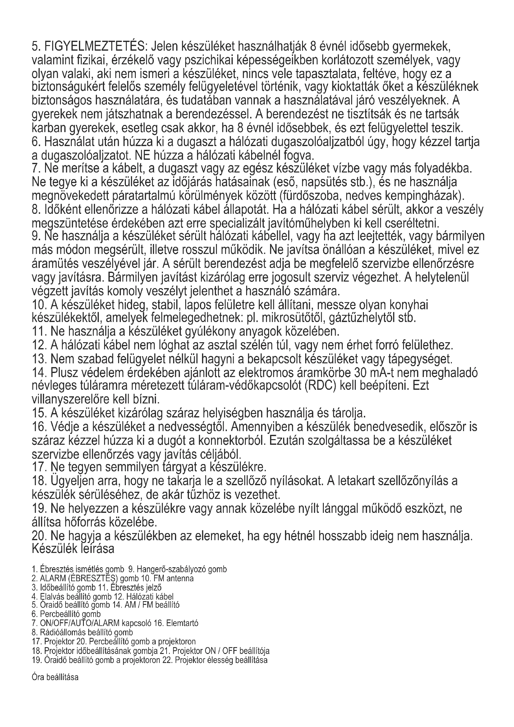 laitetta säävaikutukselle (vesisade, aurinko, jne.). Älä käytä hyvin kosteissa tiloissa A környezet védelme érdekében kérjük külön karton dobozok és műanyag zsákokat és dobja őket a megfelelő hulladék közé. Használt készüléket kell eljuttatni a kijelölt gyűjtőhelyekre miatt veszélyes elemek alkatrészeket, amelyek hatással lehetnek a környezetre. Ne dobja a készüléket a közös szemétkosárba. A készülék II. szigetelési osztályban készült, földelésre van hozzá szükség. A berendezés megfelel a következő direktíváknak: Kisfeszültségű elektromos berendezések (LVD) Elektromágneses kompatibilitás (EMC) A termék CE jelzéssel van jelölve az adattáblán Nyissa ki az elemtartót (16) és tegyen be új 9 V elemet. Az elem biztosítja az óra működését áramszünet esetén. Állítsa a kapcsolót (7) OFF állásba. Kapcsolja be a hálózati kábelt a konnektorba. Az időkijelző villogni fog. Állítsa be a pontos időt, egyidejűleg nyomja meg az időbeállító TIME (3)gombot és az óraidő HOUR (5) vagy a percbeállító MINUTE (6) gombot. Ébresztési idő beállítása Állítsa be az ébresztési időt az ALARM (ÉBRESZTÉS) (2) és az időbeállító HOUR (5) vagy percbeállító MINUTE (6) gomb egyidejű megnyomásával. Ezután állítsa be a kapcsolót (7) AUTO állásba – rádiós ébresztés vagy ALARM (ÉBRESZTÉS) – hangjellel való ébresztés. Kigyullad az ébresztés jelző (11). Az ébresztés 9 percre kikapcsolható a SNOOZE (1) gomb megnyomásával. Az ébresztés az ALARM (ÉBRESZTÉS) (2) gomb megnyomásával 24 órára leáll. Az ébresztés hosszú időre kikapcsolható a kapcsoló (7) OFF állásba állításával. Rádió automatikus kikapcsolása Megnyomva a SLEEP (4) gombot bekapcsolva hagyhatjuk alvás előtt a rádiót. Automatikusan kikapcsolódik egy óra után. A rádió korábban kikapcsolható a SNOOZE (1) gomb megnyomásával. Rádióhallgatás Állítsa a kapcsolót (7) ON állásba. Válassza ki a rádióállomást a beállító gombbal (8). Állítsa be a hangerőt(9). A rádió kikapcsolható a kapcsoló (7) OFF állásba állításával. Idő projektor (17) Kapcsolja be a projektort az ON /OFF (21) gombbal. Állítsa be a megjelenő számok élességét egy sötét helyiség falán vagy mennyezetén a beállító gomb (22) segítségével. Állítsa be a pontos időt a TIME (18) és a HOUR (19) vagy MIN (20) gomb egyidejű megnyomásával.