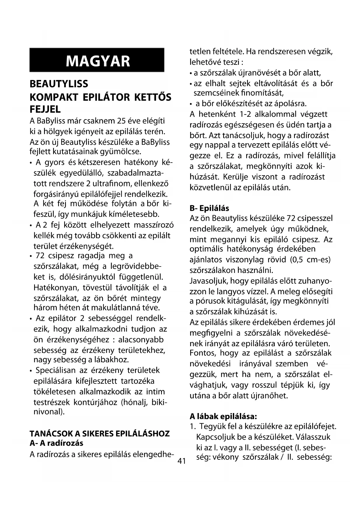 - a bőr előkészítését az ápolásra. A hetenként 1-2 alkalommal végzett radírozás egészségesen és üdén tartja a bőrt. Azt tanácsoljuk, hogy a radírozást egy nappal a tervezett epilálás előtt vé- gezze el. Ez a radírozás, mivel felállítja a szőrszálakat, megkönnyíti azok ki- húzását. Kerülje viszont a radírozást közvetlenül az epilálás után. B- Epilálás Az ön Beautyliss készüléke 72 csipesszel rendelkezik, amelyek úgy működnek, mint megannyi kis epiláló csipesz. Az optimális hatékonyság érdekében ajánlatos viszonylag rövid (0,5 cm-es) szőrszálakon használni. Javasoljuk, hogy epilálás előtt zuhanyo- zzon le langyos vízzel. A meleg elősegíti a pórusok kitágulását, így megkönnyíti a szőrszálak kihúzását is. Az epilálás sikere érdekében érdemes jól meggyelni a szőrszálak növekedésé- nek irányát az epilálásra váró területen. Fontos, hogy az epilálást a szőrszálak növekedési irányával szemben vé- gezzük, mert ha nem, a szőrszálat el- vághatjuk, vagy rosszul tépjük ki, így utána a bőr alatt újranőhet. A lábak epilálása: