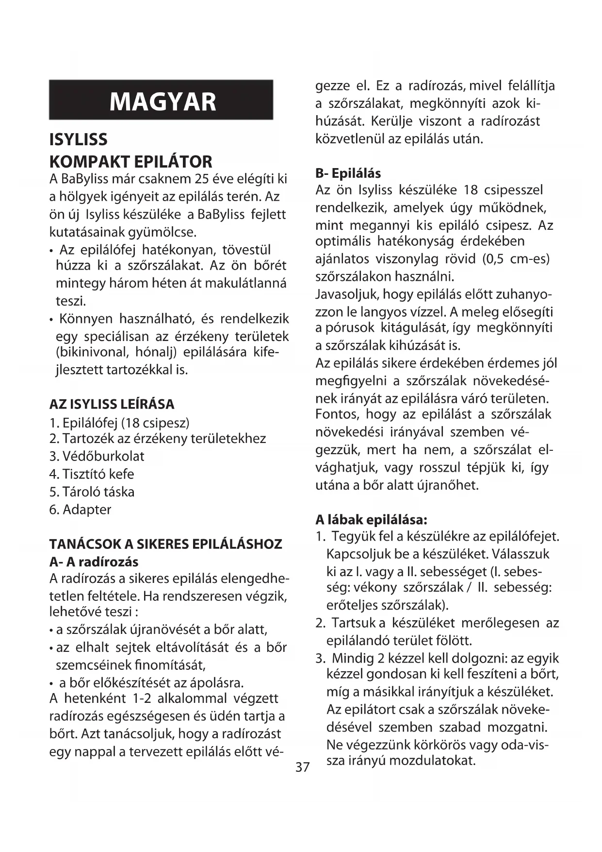 - A BaByliss Isyliss készülékét csak epilálásra szabad használni, a használa- ti tájékoztató útmutatásai alapján.