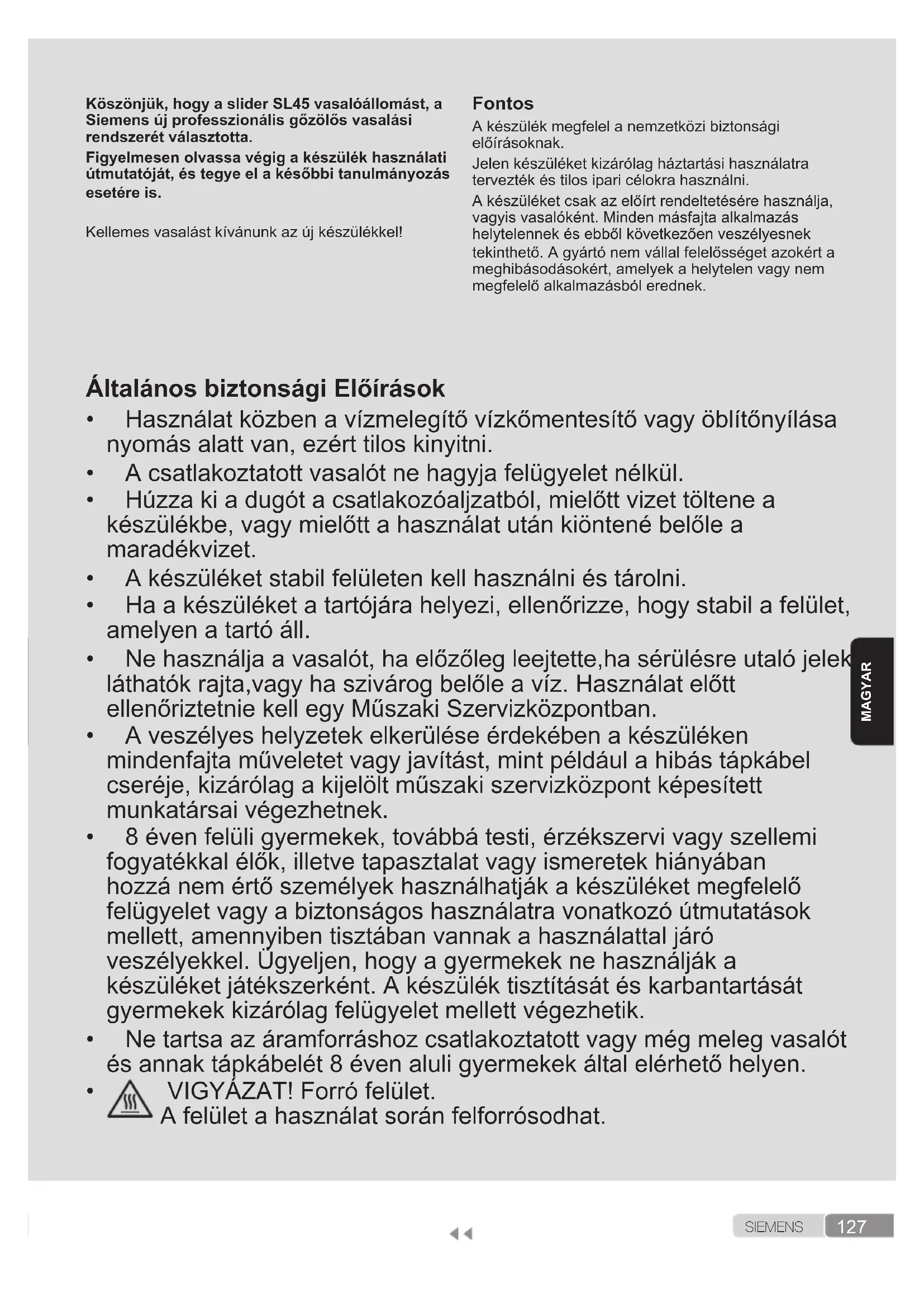 - Wystarczy ponownie nacisnąć na spust i żelazko od razu przestanie uwalniać parę. Jeżeli problem, który wystąpił, nie jest opisany w powyższej tabeli, należy skontaktować się z autoryzowanym serwisem technicznym.127 S I E M E N S MAGYAR Köszönjük, hogy a slider SL45 vasalóállomást, a Siemens új professzionális gőzölős vasalási rendszerét választotta. Figyelmesen olvassa végig a készülék használati útmutatóját, és tegye el a későbbi tanulmányozás esetére is. Kellemesvasalástkívánunkazújkészülékkel! Fontos Akészülékmegfelelanemzetközibiztonsági előírásoknak. Jelenkészüléketkizárólagháztartásihasználatra terveztékéstilosiparicélokrahasználni. Akészüléketcsakazelőírtrendeltetésérehasználja, vagyisvasalóként.Mindenmásfajtaalkalmazás helytelennekésebbőlkövetkezőenveszélyesnek tekinthető.Agyártónemvállalfelelősségetazokérta meghibásodásokért,amelyekahelytelenvagynem megfelelőalkalmazásbólerednek. Általános biztonsági Előírások