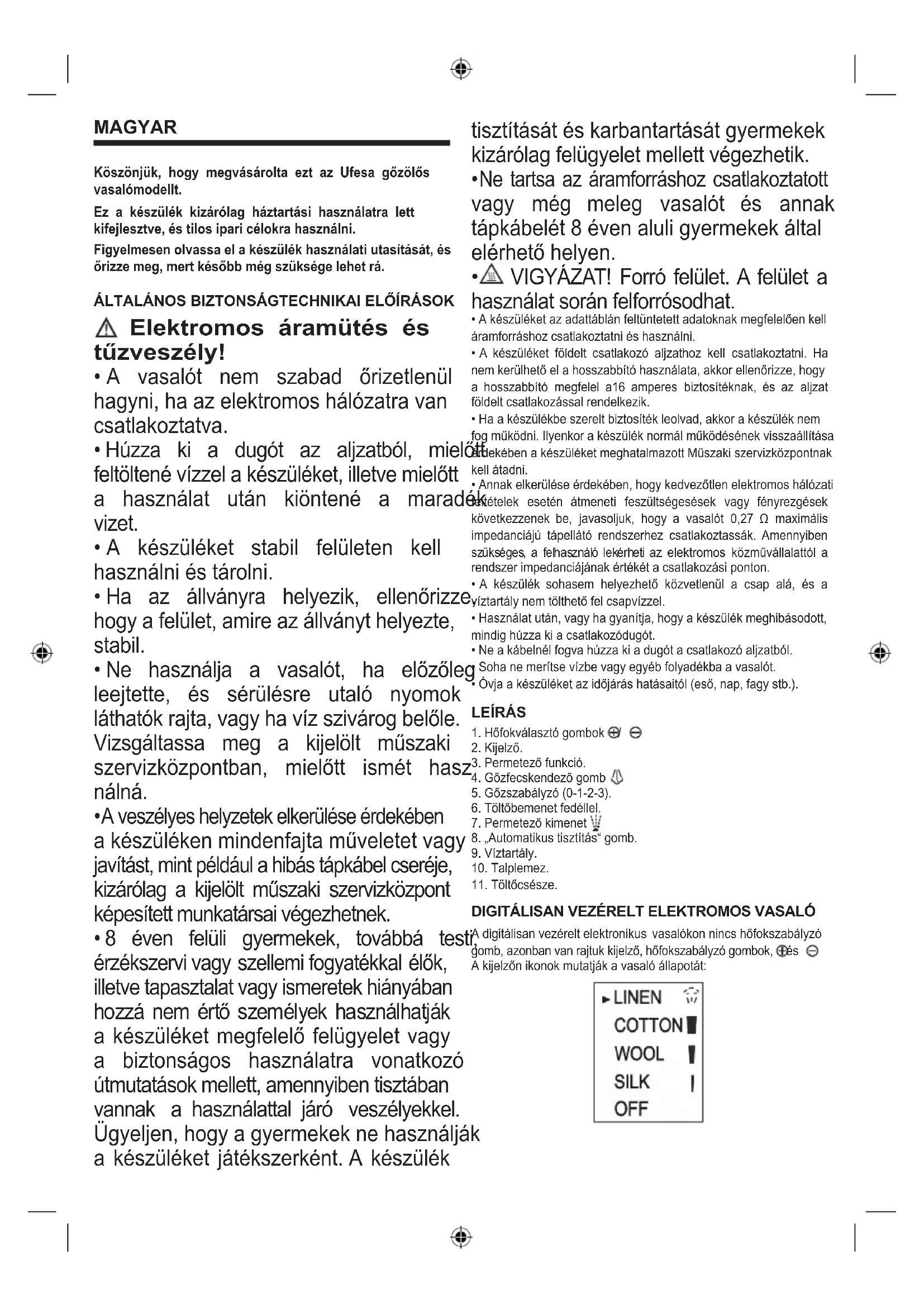 Cotton (WOOL) MAX Vászon (LINEN) Avasalóhasználataegyszerű: -Ahálózathozvalócsatlakoztatásutánakijelzővilágítanikezd,a vasalópedigkészenléti«OFF»állapotravált. -A talplemez hőfokának növeléséhez nyomja meg egymás után többszöra gombot.Avasalóakövetkezőciklustköveti: