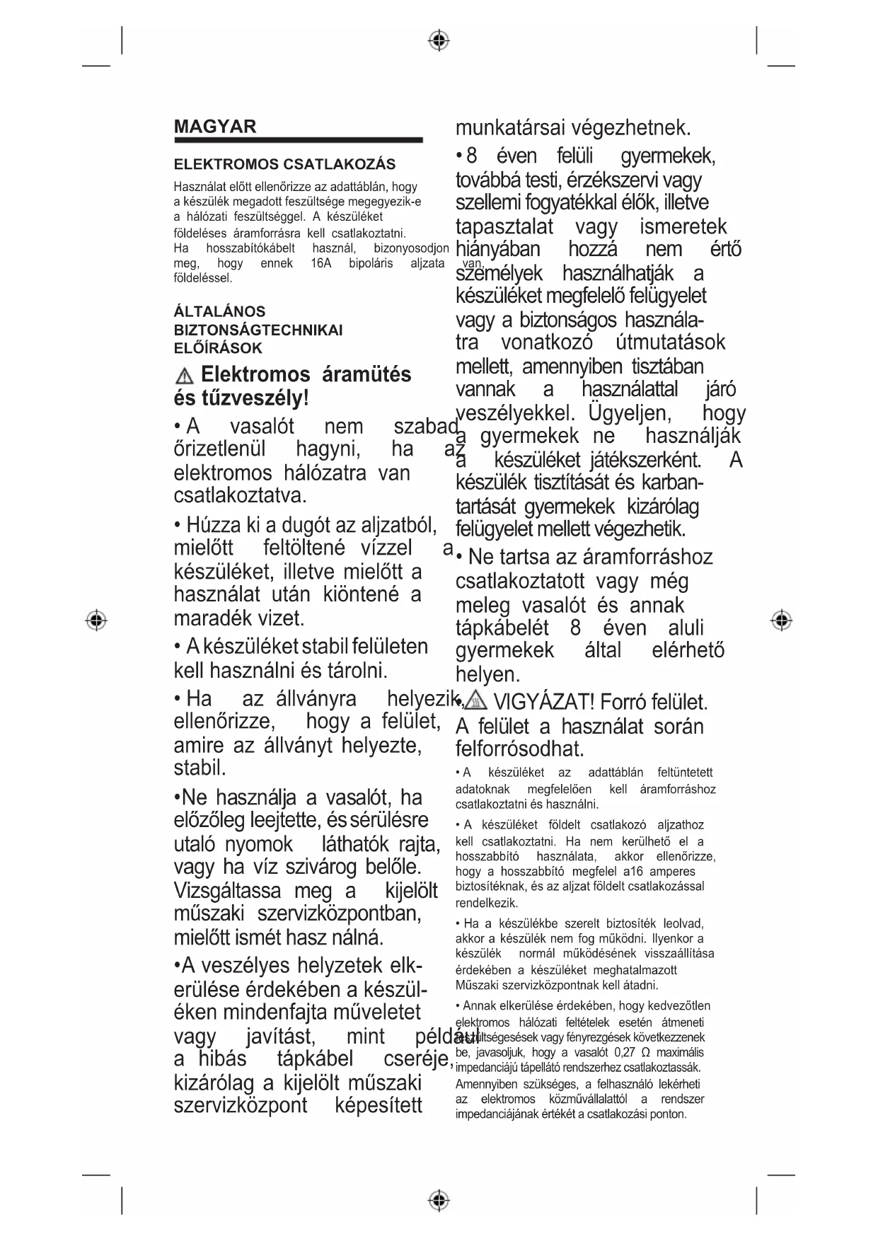 - Netartsaazáramforráshoz csatlakoztatott vagy még meleg vasalót és annak tápkábelét 8 éven aluli gyermekek által elérhető helyen.