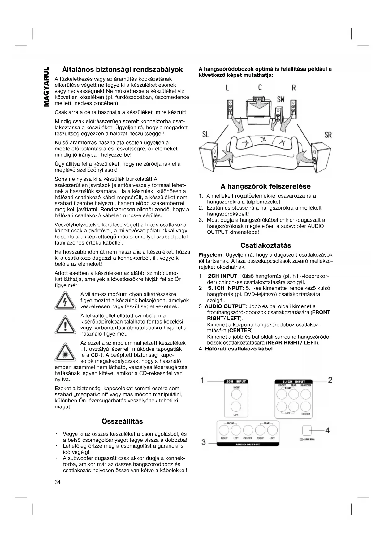 - A subwoofer dugaszát csak akkor dugja a konnektorba, amikor már az összes hangszóródoboz és csatlakozás helyesen össze van kötve a kábelekkel!