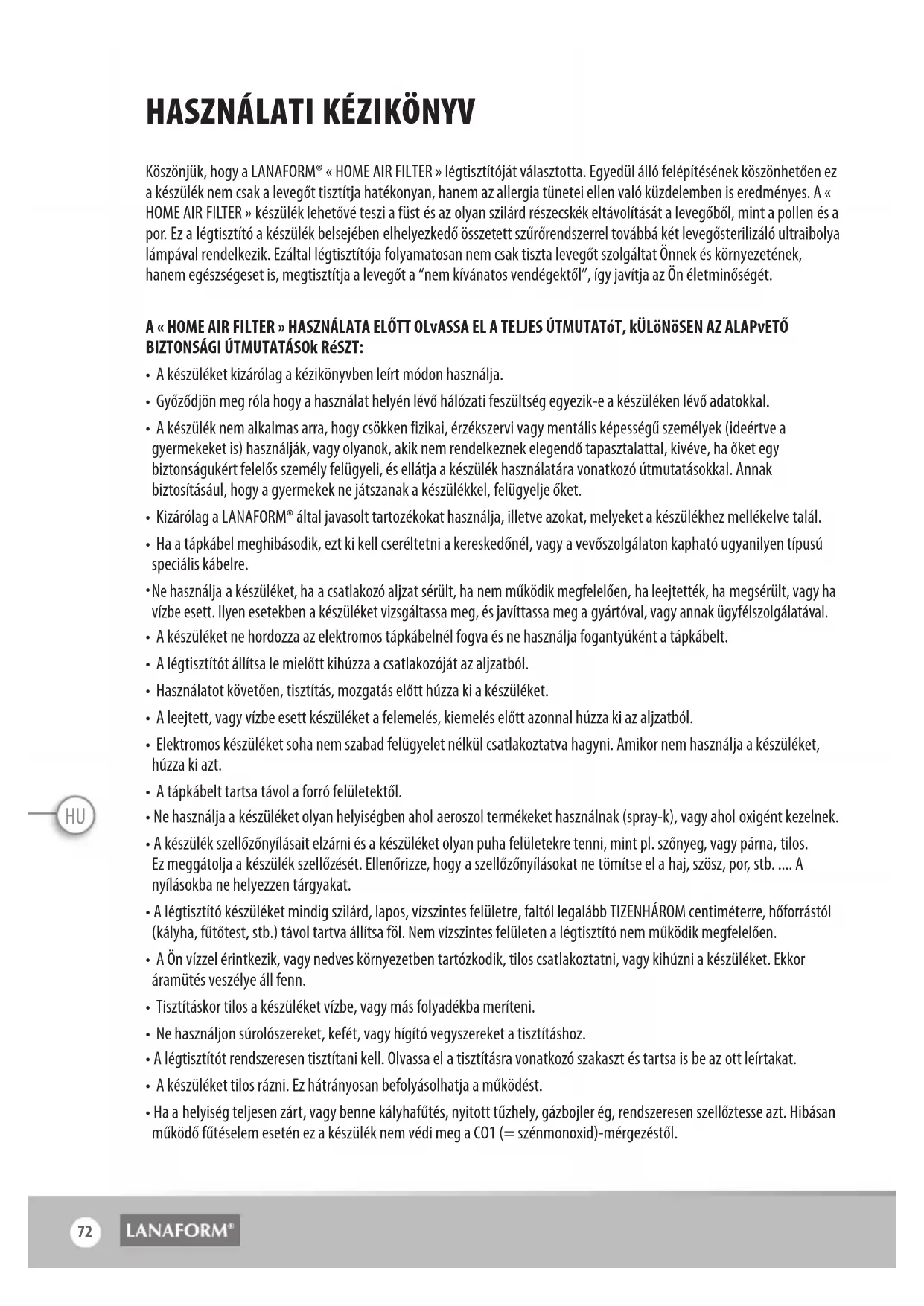 Köszönjük, hogy a LANAFORM® « HOME AIR FILTER » légtisztítóját választotta. Egyedül álló felépítésének köszönhetően ez a készülék nem csak a levegőt tisztítja hatékonyan, hanem az allergia tünetei ellen való küzdelemben is eredményes. A « HOME AIR FILTER » készülék lehetővé teszi a füst és az olyan szilárd részecskék eltávolítását a levegőből, mint a pollen és a por. Ez a légtisztító a készülék belsejében elhelyezkedő összetett szűrőrendszerrel továbbá két levegősterilizáló ultraibolya lámpával rendelkezik. Ezáltal légtisztítója folyamatosan nem csak tiszta levegőt szolgáltat Önnek és környezetének, hanem egészségeset is, megtisztítja a levegőt a “nem kívánatos vendégektől”, így javítja az Ön életminőségét. A « HOME AIR FILTER » HASZNÁLATA ELŐTT OLvASSA EL A TELJES ÚTMUTATóT, kÜLöNöSEN AZ ALAPvETŐ BIZTONSÁGI ÚTMUTATÁSOk RéSZT: