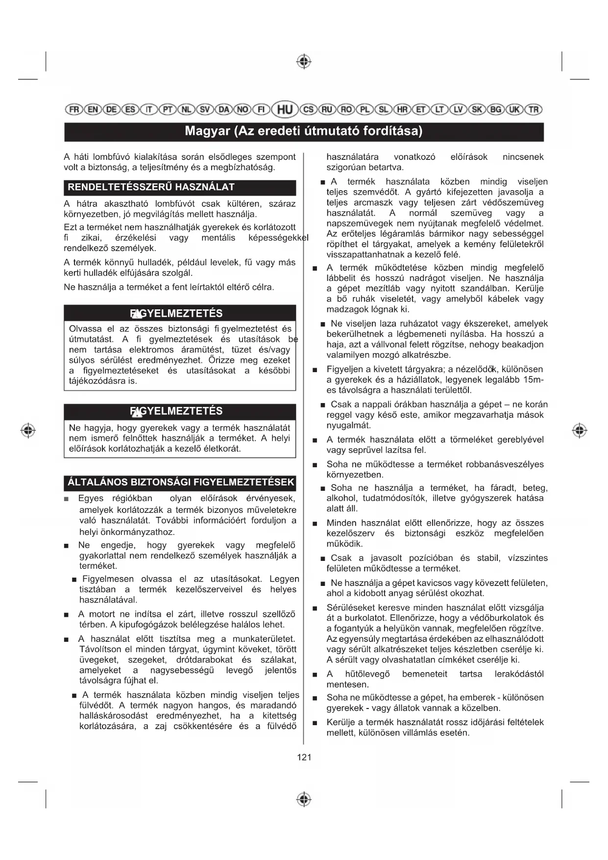 ■ Egyes régiókban olyan előírások érvényesek, amelyek korlátozzák a termék bizonyos műveletekre való használatát. További információért forduljon a helyi önkormányzathoz. ■ Ne engedje, hogy gyerekek vagy megfelelő gyakorlattal nem rendelkező személyek használják a terméket. ■ Figyelmesen olvassa el az utasításokat. Legyen tisztában a termék kezelőszerveivel és helyes használatával. ■ A motort ne indítsa el zárt, illetve rosszul szellőző térben. A kipufogógázok belélegzése halálos lehet. ■ A használat előtt tisztítsa meg a munkaterületet. Távolítson el minden tárgyat, úgymint köveket, törött üvegeket, szegeket, drótdarabokat és szálakat, amelyeket a nagysebességű levegő jelentős távolságra fújhat el. ■ A termék használata közben mindig viseljen teljes fülvédőt. A termék nagyon hangos, és maradandó halláskárosodást eredményezhet, ha a kitettség korlátozására, a zaj csökkentésére és a fülvédő használatára vonatkozó előírások nincsenek szigorúan betartva. ■ A termék használata közben mindig viseljen teljes szemvédőt. A gyártó kifejezetten javasolja a teljes arcmaszk vagy teljesen zárt védőszemüveg használatát. A normál szemüveg vagy a napszemüvegek nem nyújtanak megfelelő védelmet. Az erőteljes légáramlás bármikor nagy sebességgel röpíthet el tárgyakat, amelyek a kemény felületekről visszapattanhatnak a kezelő felé. ■ A termék működtetése közben mindig megfelelő lábbelit és hosszú nadrágot viseljen. Ne használja a gépet mezítláb vagy nyitott szandálban. Kerülje a bő ruhák viseletét, vagy amelyből kábelek vagy madzagok lógnak ki. ■ Ne viseljen laza ruházatot vagy ékszereket, amelyek bekerülhetnek a légbemeneti nyílásba. Ha hosszú a haja, azt a vállvonal felett rögzítse, nehogy beakadjon valamilyen mozgó alkatrészbe. ■ Figyeljen a kivetett tárgyakra; a nézelődő k, különösen a gyerekek és a háziállatok, legyenek legalább 15m- es távolságra a használati területtől. ■ Csak a nappali órákban használja a gépet – ne korán reggel vagy késő este, amikor megzavarhatja mások nyugalmát. ■ A termék használata előtt a törmeléket gereblyével vagy seprűvel lazítsa fel. ■ Soha ne működtesse a terméket robbanásveszélyes környezetben. ■ Soha ne használja a terméket, ha fáradt, beteg, alkohol, tudatmódosítók, illetve gyógyszerek hatása alatt áll. ■ Minden használat előtt ellenőrizze, hogy az összes kezelőszerv és biztonsági eszköz megfelelően működik. ■ Csak a javasolt pozícióban és stabil, vízszintes felületen működtesse a terméket. ■ Ne használja a gépet kavicsos vagy kövezett felületen, ahol a kidobott anyag sérülést okozhat. ■ Sérüléseket keresve minden használat előtt vizsgálja át a burkolatot. Ellenőrizze, hogy a védőburkolatok és a fogantyúk a helyükön vannak, megfelelően rögzítve. Az egyensúly megtartása érdekében az elhasználódott vagy sérült alkatrészeket teljes készletben cserélje ki. A sérült vagy olvashatatlan címkéket cserélje ki. ■ A hűtőlevegő bemeneteit tartsa lerakódástól mentesen. ■ Soha ne működtesse a gépet, ha emberek - különösen gyerekek - vagy állatok vannak a közelben. ■ Kerülje a termék használatát rossz időjárási feltételek mellett, különösen villámlás esetén.122 Magyar (Az eredeti útmutató fordítása) ■ Ne használja a gépet gyenge megvilágítás esetén. A kezelőnek tiszta rálátással kell rendelkeznie a munkaterületre, hogy azonosíthassa a potenciális veszélyeket. ■ Hasonló gépek egymás közelében történő használata növeli a halláskárosodás veszélyét, valamint annak veszélyét, hogy más személyek lépnek be az Ön munkaterületére. ■ Mindig biztosan támaszkodjon meg a lejtőkön. Gyalogoljon, ne fusson. ■ Mindig tartson megfelelő testtartást és egyensúlyt. Ne hajoljon ki túlságosan. A túlzott kihajlás egyensúlyvesztést eredményezhet. ■ Soha ne működtesse a terméket hibás védőburkolatokkal vagy védőlemezekkel, illetve biztonsági berendezések, például felhelyezett hulladékgyűjtő nélkül. ■ Semmilyen módon ne módosítsa a gépet vagy használjon a gyártó által nem ajánlott alkatrészeket és tartozékokat. FIGYELMEZTETÉS Ha a gép leesett, erős ütést kapott vagy rendellenesen kezd vibrálni, azonnal állítsa le a gépet, és vizsgálja át sérülések tekintetében vagy azonosítsa a vibráció okát. Minden sérülést hivatalos szervizközpontban kell megjavíttatni vagy kicseréltetni. ■ Ne érjen a gép hangtompítója vagy a motor körüli területekhez, mert ezek a részek működés közben felforrósodnak. ■ Az üzemanyag újratöltése előtt állítsa le a motort és várjon, amíg a termék lehűl. ■ Az üzemanyag újratöltéséhez és keveréséhez jól szellőző helyet válasszon, ahol nincs nyílt láng, szikrák vagy egyéb gyújtóforrás, illetve nincsenek gyúlékony anyagok. ■ Ne dohányozzon az üzemanyag keverése vagy betöltése közben. ■ Az üzemanyagot benzineskannában tárolja és keverje. ■ A közelben tartson egy megfelelő típusú tűzoltó készüléket, hogy elolthassa az üzemanyagtüzeket. ■ A motor elindítása előtt ne felejtse el az üzemanyagtank sapkáját szorosan visszatenni. Bizonyosodjon meg arról, hogy a benzin nem folyik a szerszámból. ■ Törölje le a kifolyt benzint. A motor indítása előtt távolodjon el 9 méter távolságra attól a helytől, ahol az üzemanyagot betöltötte. ■ A forgó alkatrészek megérintéséből eredő balesetveszély csökkentésére minden esetben állítsa le a motort és húzza ki a gyújtógyertya-pipát. A következő műveletek előtt győződjön meg arról, hogy minden mozgó alkatrész teljesen megállt: ● a termék felügyelet nélkül hagyása ● dugulá