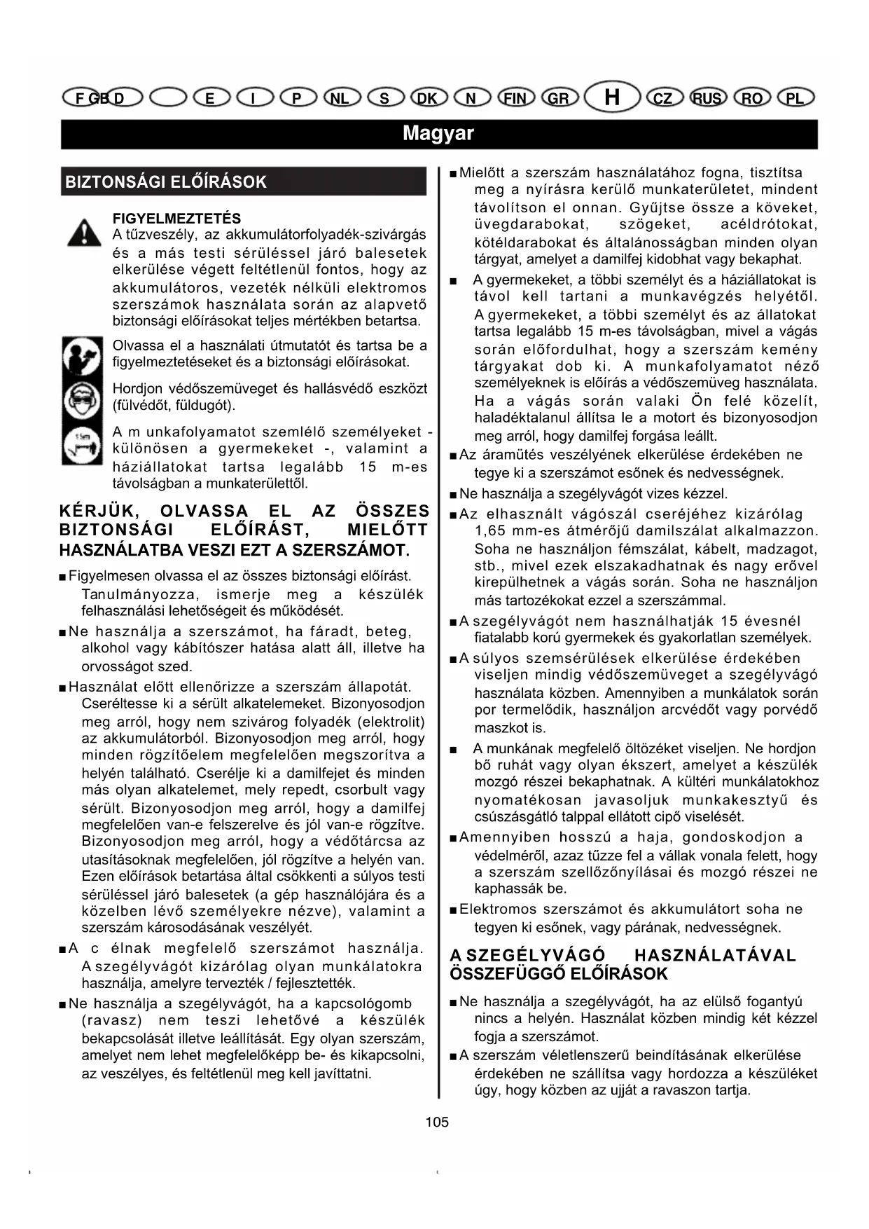 E I P NL S DK N FIN H CZ RUS RO PL CLT-1423P / 1823 P manual 24/11/04 11:57 Page 104BIZTONSÁGI ELŐÍRÁSOK FIGYELMEZTETÉS A tűzveszély, az akkumulátorfolyadék-szivárgás és a más testi sérüléssel járó balesetek elkerülése végett feltétlenül fontos, hogy az akkumulátoros, vezeték nélküli elektromos szerszámok használata során az alapvető biztonsági előírásokat teljes mértékben betartsa. Olvassa el a használati útmutatót és tartsa be a figyelmeztetéseket és a biztonsági előírásokat. Hordjon védőszemüveget és hallásvédő eszközt (fülvédőt, füldugót). Amunkafolyamatot szemlélő személyeket - különösen a gyermekeket -, valamint a háziállatokat tartsa legalább 15 m-es távolságban a munkaterülettől. KÉRJÜK, OLVASSA EL AZ ÖSSZES BIZTONSÁGI ELŐÍRÁST, MIELŐTT HASZNÁLATBA VESZI EZT A SZERSZÁMOT. ■ Figyelmesen olvassa el az összes biztonsági előírást. Tanulmányozza, ismerje meg a készülék felhasználási lehetőségeit és működését. ■ Ne használja a szerszámot, ha fáradt, beteg, alkohol vagy kábítószer hatása alatt áll, illetve ha orvosságot szed. ■ Használat előtt ellenőrizze a szerszám állapotát. Cseréltesse ki a sérült alkatelemeket. Bizonyosodjon meg arról, hogy nem szivárog folyadék (elektrolit) az akkumulátorból. Bizonyosodjon meg arról, hogy minden rögzítőelem megfelelően megszorítva a helyén található. Cserélje ki a damilfejet és minden más olyan alkatelemet, mely repedt, csorbult vagy sérült. Bizonyosodjon meg arról, hogy a damilfej megfelelően van-e felszerelve és jól van-e rögzítve. Bizonyosodjon meg arról, hogy a védőtárcsa az utasításoknak megfelelően, jól rögzítve a helyén van. Ezen előírások betartása által csökkenti a súlyos testi sérüléssel járó balesetek (a gép használójára és a közelben lévő személyekre nézve), valamint a szerszám károsodásának veszélyét. ■ Acélnak megfelelő szerszámot használja. A szegélyvágót kizárólag olyan munkálatokra használja, amelyre tervezték / fejlesztették. ■ Ne használja a szegélyvágót, ha a kapcsológomb (ravasz) nem teszi lehetővé a készülék bekapcsolását illetve leállítását. Egy olyan szerszám, amelyet nem lehet megfelelőképp be- és kikapcsolni, az veszélyes, és feltétlenül meg kell javíttatni. ■ Mielőtt a szerszám használatához fogna, tisztítsa meg a nyírásra kerülő munkaterületet, mindent távolítson el onnan. Gyűjtse össze a köveket, üvegdarabokat, szögeket, acéldrótokat, kötéldarabokat és általánosságban minden olyan tárgyat, amelyet a damilfej kidobhat vagy bekaphat. ■ A gyermekeket, a többi személyt és a háziállatokat is távol kell tartani a munkavégzés helyétől. A gyermekeket, a többi személyt és az állatokat tartsa legalább 15 m-es távolságban, mivel a vágás során előfordulhat, hogy a szerszám kemény tárgyakat dob ki. A munkafolyamatot néző személyeknek is előírás a védőszemüveg használata. Ha a vágás során valaki Ön felé közelít, haladéktalanul állítsa le a motort és bizonyosodjon meg arról, hogy damilfej forgása leállt. ■ Az áramütés veszélyének elkerülése érdekében ne tegye ki a szerszámot esőnek és nedvességnek. ■ Ne használja a szegélyvágót vizes kézzel. ■ Az elhasznált vágószál cseréjéhez kizárólag 1,65 mm-es átmérőjű damilszálat alkalmazzon. Soha ne használjon fémszálat, kábelt, madzagot, stb., mivel ezek elszakadhatnak és nagy erővel kirepülhetnek a vágás során. Soha ne használjon más tartozékokat ezzel a szerszámmal. ■ A szegélyvágót nem használhatják 15 évesnél fiatalabb korú gyermekek és gyakorlatlan személyek. ■ A súlyos szemsérülések elkerülése érdekében viseljen mindig védőszemüveget a szegélyvágó használata közben. Amennyiben a munkálatok során por termelődik, használjon arcvédőt vagy porvédő maszkot is. ■ A munkának megfelelő öltözéket viseljen. Ne hordjon bő ruhát vagy olyan ékszert, amelyet a készülék mozgó részei bekaphatnak. A kültéri munkálatokhoz nyomatékosan javasoljuk munkakesztyű és csúszásgátló talppal ellátott cipő viselését. ■ Amennyiben hosszú a haja, gondoskodjon a védelméről, azaz tűzze fel a vállak vonala felett, hogy a szerszám szellőzőnyílásai és mozgó részei ne kaphassák be. ■ Elektromos szerszámot és akkumulátort soha ne tegyen ki esőnek, vagy párának, nedvességnek. A SZEGÉLYVÁGÓ HASZNÁLATÁVAL