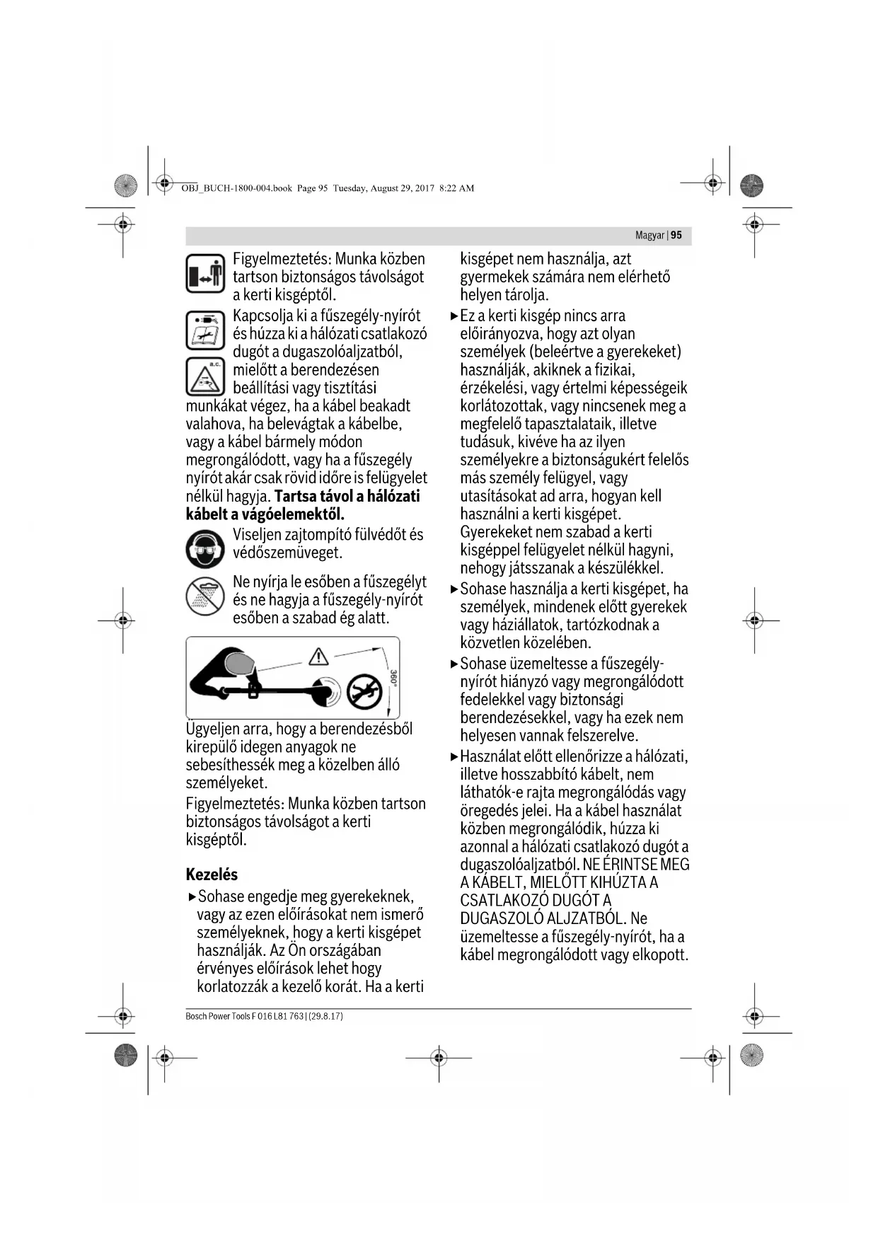 DUGASZOLÓ ALJZATBÓL. Ne üzemeltesse a fűszegély-nyírót, ha a kábel megrongálódott vagy elkopott. OBJ_BUCH-1800-004.book Page 95 Tuesday, August 29, 2017 8:22 AM96 | Magyar F 016 L81 763 | (29.8.17) Bosch Power Tools Használat előtt és minden ütés után ellenőrizze a kerti kisgépet, nincs-e elhasználódva, vagy nem rongálódott-e meg, szükség esetén javíttassa meg. Ne használja a kerti kisgépet, ha fáradt, beteg, vagy alkohol, kábítószerek vagy orvosságok hatása alatt áll. Viseljen hosszú, vastag nadrágot, erős anyagból készült cipőt és kesztyűt. Ne viseljen bő ruhát, ékszereket, rövidnadrágot, szandált és ne dolgozzon mezítláb. Ha hosszú hajjal jár, kösse fel azt vállmagasság felett, nehogy beakadjon a berendezés mozgó részeibe. A kerti kisgép kezeléséhez viseljen védőszemüveget és zajtompító fülvédőt. Mindig szilárd alapon álljon és őrizze meg az egyensúlyát. Ne erőltesse túl magát. Sohase üzemeltesse a fűszegély- nyírót, ha személyek, mindenek előtt gyerekek vagy háziállatok, tartózkodnak a közvetlen közelében. A más személyek által elszenvedett balesetekért, illetve a más tulajdonában keletkezett károkért a kezelő vagy felhasználó felel. Várjon, amíg a forgó vágóelemek teljesen leállnak, mielőtt hozzájuk érne. A vágóelemek a fűszegély-nyíró kikapcsolása után még tovább forognak és sérüléseket okozhatnak. Csak nappali fénynél vagy jó mesterséges megvilágitás mellett dolgozzon. Rossz időjárási viszonyok esetén, és főleg ha vihar készül, ne dolgozzon a fűszegély-nyíróval. Ha a fűszegély-nyírót nedves fűben használja, ez csökkenti a munkateljesítményt. Kapcsolja ki a fűszegély-nyírót, amikor azt a megmunkálandó felülethez szállítja, vagy onnan elszállítja. Csak akkor kapcsolja be a fűszegély- nyírót, ha a kezei és lábai elég messze vannak a forgó vágóelemektől. Vigyázat – ne érjen hozzá a forgó vágóhuzalhoz. Sohase jöjjön a kezével vagy a lábával a forgó vágóelemek közelébe. Ehhez a fűszegély-nyíróhoz sohase használjon fémből készült vágóelemeket. Rendszeresen ellenőrizze és tartsa karban a fűszegély-nyírót. A fűszegély-nyírót csak erre feljogosított javítóműhelyekben szabad javíttatni. Mindig gondoskodjon arról, hogy a szellőzőnyilások szabadon maradjanak a fűmaradványoktól. Óvakodjon a huzal méretre vágására szolgáló beépített kés által okozott sérülésektől. A huzal feltöltése/ utántöltése után mindig forgassa el a fűszegély-nyírót a vízszintes munkavégzési helyzetbe, mielőtt bekapcsolja. OBJ_BUCH-1800-004.book Page 96 Tuesday, August 29, 2017 8:22 AMMagyar | 97 Bosch Power Tools F 016 L81 763 | (29.8.17) Kapcsolja ki a kerti kisgépet és húzza ki a hálózati csatlakozó dugót a dugaszoló aljzatból: – minden esetben, ha a kerti kisgépet felügyelet nélkül hagyja – a tekercs kicserélése előtt – ha a kábel összecsomózódott, – a tisztítás előtt, vagy ha a fűszegély- nyírón valamilyen munkát hajt végre Húzza ki a munka befejezése után a hálózati csatlakozó dugót és ellenőrizze, nem rongálódott-e meg a kerti kisgép. A kerti kisgépet egy biztonságos, száraz helységben, a gyerekek által el nem érhető helyen tárolja. Ne tegyen más tárgyakat a kerti kisgépre. Az elkopott, vagy megrongálódott alkatrészeket biztonsági meggondolásokból cserélje ki. Gondoskodjon arról, hogy a cserealkatrészként csak Bosch gyártmányú alkatrészeket használjanak. Sohase helyezze üzembe a kerti kisgépet, ha arra nincsenek felszerelve a hozzátartozó alkatrészek. Elektromos biztonsági előírások Figyelem! A karbantartási vagy tisztítási munkák megkezdése előtt kapcsolja ki a kerti kisgépet és húzza ki a hálózati csatlakozó dugót. Ugyanez érvényes azokra az esetekre is, amikor a hálózati csatlakozó kábel megrongálódott, belevágtak, vagy beakadt valamibe. Az Ön kerti kisgépe biztonsági meggondolásokból védőszigeteléssel van ellátva és földelésre nincs szüksége. Az üzemi feszültség 230 V AC, 50 Hz (az EU-n kívüli országokban 220 V vagy 240 V is lehetséges). Csak engedélyezett hosszabbító kábelt használjon. További információkat az erre feljogosított vevőszolgálattól kaphat. A biztonság megnövelésére használjon egy legfeljebb 30 mA hibaáramú hibaáram-kapcsolót. Ezt a hibaáramkapcsolót minden egyes használat előtt ellenőrizni kell. Tartsa távol a hálózati tápvezetéket és a hosszabbító kábelt a mozgó alkatrészektől és előzze meg a kábelek bárminemű megrongálódását, amely feszültség alatt álló alkatrészek érintéséhez vezethet. A kábelösszeköttetéseket (a csatlakozó dugókat és a dugaszoló aljzatokat) szárazon kell tartani, és nem szabad közvetlenül a földre fektetni. A hálózati és hosszabbító kábel megrongálódásának esetleges jeleit rendszeresen ellenőrizni kell, a kábeleket csak kifogástalan állapotban szabad használni. Ha a készülék hálózati kábelje megrongálódott, azt csak egy feljogosított Bosch-műhellyel szabad megjavíttatni. Csak engedélyezett hosszabbító kábeleket használjon. Csak olyan hosszabbító kábeleket, vezetékeket és kábeldobokat használjon, amelyek megfelelnek az OBJ_BUCH-1800-004.book Page 97 Tuesday, August 29, 2017 8:22 AM98 | Magyar F 016 L81 763 | (29.8.17) Bosch Power Tools EN 61242 / IEC 61242 vagy az IEC 60884-2-7 szabványnak. Ha a készülék üzemeltetéséhez egy hosszabbító kábelt akar használni, akkor a következő vezeték keresztmetszetekre van szükség: – A vezeték keresztmetszetet 1,25 mm