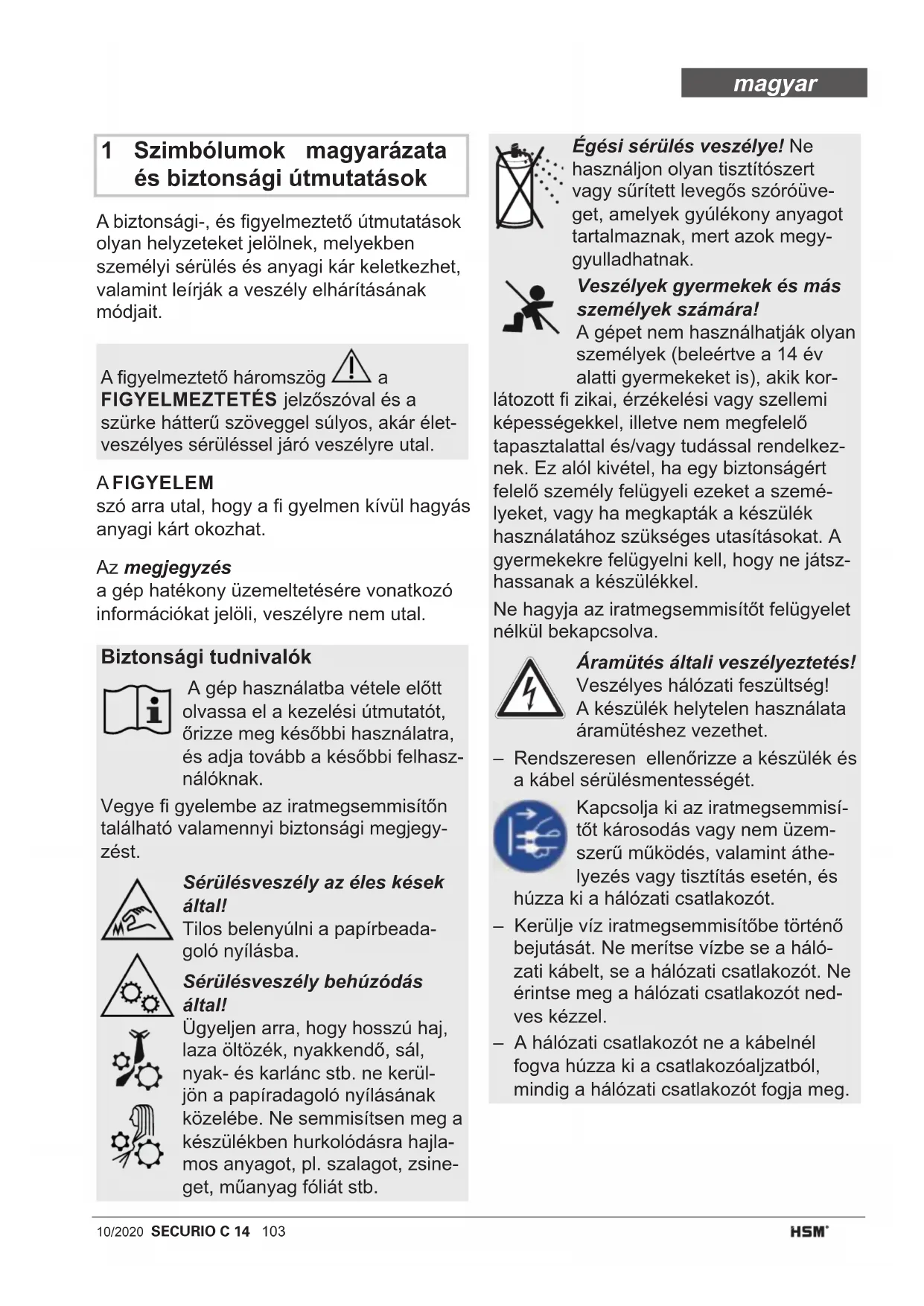 Težina 4,0 kg 4,5 kg Snaga uz maks. broj listova 160 W (EU) / 145 W (SAD) Emitirana razina zvučnog tlaka (u praznom hodu / pod opterećenjem) 55-60 dB(A) / 60-65 dB(A) 55-60 dB(A) / 65-70 dB(A) Širina ulaza 225 mm Brzina rezanja 44 mm/s Priključak 220-240 V / 50/60 Hz 110-130 V / 60 Hz Potrošnja energije u načinu pripravnosti < 2 Wh Vrijeme pogona do 15 min Uvjeti okoline u radu: Temperatura Relativna vlažnost zraka Nadmorska visina -10 °C do +25 °C maks. 90 %, bez kondenzacije maks. 2.000 m Dimenzije Š × D × V (mm) 366 × 258 × 405 Volumen spremnika uništenog materijala 20 l A procijenjena razina zvučnog tlaka (LW / Ad u praznom hodu) 65,9 dB Električni i elektronički stari ure- đaji sadrže mnogo još vrijednih materijala, ali dijelom i štetne tvari koje su potrebne za rad i sigur- nost. U slučaju pogrešnog odlaga- nja u otpad ili rukovanja one mogu biti opasne po ljudsko zdravlje i okoliš. Stare uređaje nikada nemojte bacati u biološki otpad. Pridržavajte se aktualnih propisa i električne i elektroničke stare uređaje odne- site na sakupljališta na predaju i oporabu. Ambalažni materijal također odnesite na ekološki prikladno odlagalište otpada. hrvatski10/2020 SECURIO C 14 103 1 Szimbólumok magyarázata és biztonsági útmutatások A biztonsági-, és fi gyelmeztető útmutatások olyan helyzeteket jelölnek, melyekben személyi sérülés és anyagi kár keletkezhet, valamint leírják a veszély elhárításának módjait. Az megjegyzés a gép hatékony üzemeltetésére vonatkozó információkat jelöli, veszélyre nem utal. A fi gyelmeztető háromszög a FIGYELMEZTETÉS jelzőszóval és a szürke hátterű szöveggel súlyos, akár élet- veszélyes sérüléssel járó veszélyre utal. A FIGYELEM szó arra utal, hogy a fi gyelmen kívül hagyás anyagi kárt okozhat. Biztonsági tudnivalók A gép használatba vétele előtt olvassa el a kezelési útmutatót, őrizze meg későbbi használatra, és adja tovább a későbbi felhasz- nálóknak. Vegye fi gyelembe az iratmegsemmisítőn található valamennyi biztonsági megjegy- zést. Sérülésveszély az éles kések által! Tilos belenyúlni a papírbeada- goló nyílásba. Sérülésveszély behúzódás által! Ügyeljen arra, hogy hosszú haj, laza öltözék, nyakkendő, sál, nyak- és karlánc stb. ne kerül- jön a papíradagoló nyílásának közelébe. Ne semmisítsen meg a készülékben hurkolódásra hajla- mos anyagot, pl. szalagot, zsine- get, műanyag fóliát stb. Égési sérülés veszélye! Ne használjon olyan tisztítószert vagy sűrített levegős szóróüve- get, amelyek gyúlékony anyagot tartalmaznak, mert azok megy- gyulladhatnak. Veszélyek gyermekek és más személyek számára! A gépet nem használhatják olyan személyek (beleértve a 14 év alatti gyermekeket is), akik kor- látozott fi zikai, érzékelési vagy szellemi képességekkel, illetve nem megfelelő tapasztalattal és/vagy tudással rendelkez- nek. Ez alól kivétel, ha egy biztonságért felelő személy felügyeli ezeket a szemé- lyeket, vagy ha megkapták a készülék használatához szükséges utasításokat. A gyermekekre felügyelni kell, hogy ne játsz- hassanak a készülékkel. Ne hagyja az iratmegsemmisítőt felügyelet nélkül bekapcsolva. Áramütés általi veszélyeztetés! Veszélyes hálózati feszültség! A készülék helytelen használata áramütéshez vezethet. – Rendszeresen ellenőrizze a készülék és a kábel sérülésmentességét. Kapcsolja ki az iratmegsemmisí- tőt károsodás vagy nem üzem- szerű működés, valamint áthe- lyezés vagy tisztítás esetén, és húzza ki a hálózati csatlakozót. – Kerülje víz iratmegsemmisítőbe történő bejutását. Ne merítse vízbe se a háló- zati kábelt, se a hálózati csatlakozót. Ne érintse meg a hálózati csatlakozót ned- ves kézzel. – A hálózati csatlakozót ne a kábelnél fogva húzza ki a csatlakozóaljzatból, mindig a hálózati csatlakozót fogja meg. magyar104 SECURIO C 14 10/2020 3 Áttekintés 4 A szállítmány tartalma