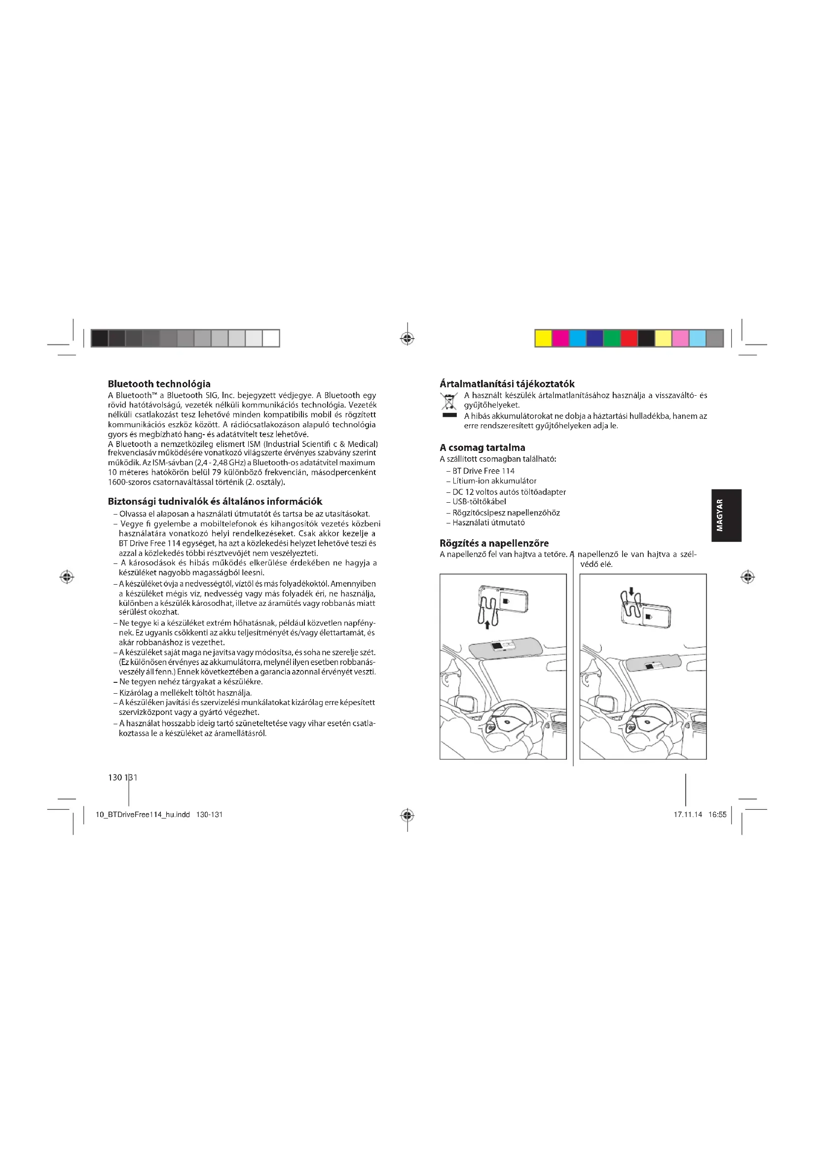 Az akkumulátorral kapcsolatos tudnivalók Az eszköz a legújabb lítium-ionos akkuval rendelkezik, amely kompatibilis a Nokia BL-5B akkumulátorral. Egy új akkumulátor maximális teljesítménye csak 2-3 teljes töltési ciklus után érhető el. Az akkumulátor néhány száz alkalommal feltölthető és lemeríthető, de idővel a kapacitása csökken. Az akkumulátor feltöltése után csatlakoztassa le a BT Drive Free 114 egységet az áramellátásról, mivel a túltöltés csökkenti az akkumulátor élettartamát. Használaton kívül a feltöltött akkumulátor veszít a kapacitásából. Fontos! Ügyeljen arra, hogy az akkumulátor teljesen fel legyen töltve, ha a készüléket hosszabb ideig nem használja. Az akkumulátor mélykisülésének megakadályozása érdekében a BT Drive Free 114 egységet legalább kétha- vonta fel kell tölteni. Az akku feltöltése A BT Drive Free 114 újratölthető akkumulátorról üzemel. Töltse fel teljesen az akkumulátort az első használat előtt. A töltés elindítása előtt olvassa el „Az akkumulátorral kapcsolatos tudnivalók” című fejezetet. Csatlakoztassa a BT Drive Free 114 egységet az USB-kábellel az autós töltőadapterhez. Dugja be a töltőadaptert a jármű szivargyújtó csatlakozó- jába. A BT Drive Free 114 USB-kábelen keresztül számítógépről is feltölthető. Tudnivaló: A töltő csatlakoztatásakor a BT Drive Free 114 kikapcsol. Töltés közben az MF gomb pirosan világít. Ha az akku teljesen feltöltődött, a piros szín kékre vált. Az akku feltöltése kb. 3 óráig tart. A feltöltés után válassza le a BT Drive Free 114 egységet a töltőről. A teljesen feltöltött akkumulátor 15 órányi beszélgetési időt, illetve 500 órányi készenléti időt biztosít. Ha az akkumulátor kezd kimerülni, akkor az MF gomb 3 másodpercenként villog és 60 másodpercenként figyelmeztető hang hallható. Tudnivaló: iPhone-nal való csatlakozásnál a BT Drive Free 114 akkujának állapotát a szimbólum mutatja az iPhone kijelzőjén. 10_BTDriveFree114_hu.indd 132-13310_BTDriveFree114_hu.indd 132-133 17.11.14 16:5517.11.14 16:55134 135 MAGYAR Áttekintés Hangszóró MODE gomb NFC érzékelő Mikrofon Hangerő növelés (+) MF gomb (megvilágított funkciós gomb) Hangerő csökkentése (–) Rögzítőcsipesz napellenzőhöz Töltőaljzat (Micro-USB csatlakozó) Akkurekesz Be- és kikapcsolás Bekapcsolás A bekapcsoláshoz tartsa nyomva 3 másodpercig az MF gombot, amíg magas jelzőhang hallatszik és a gomb kéken kezd világítani. Az MF gomb ezután kéken villog és a készülék bekapcsolt állapotban van. Tudnivaló: Bekapcsolás után a BT Drive Free 114 automatikusan csatlakozik a legutóbb csatlakoztatott mobiltelefonhoz. Kikapcsolás A kikapcsoláshoz tartsa nyomva 3 másodpercig az MF gombot, amíg mély jelzőhang hallatszik és a gomb pirosan kezd világítani. A készülék ezután kikapcsol. A mobiltelefon felismertetése (párosítás (Pairing)) és csatlakoztatás A BT Drive Free 114 egységet a használatba vétel előtt az adott Bluetooth- képes mobiltelefonnal össze kell párosítani. A párosítás egy egyszeri eljárás, és csak a mobiltelefonhoz való első csatlakoztatáskor kell végrehajtani. A BT Drive Free 114 maximum nyolc mobiltelefonhoz párosítható és egyszerre két mobiltelefonnal lehet kapcsolatban. NFC intelligens párosítás Az NFC intelligens párosítás rendelkezésre áll a BT Drive Free 114 készüléken, így a párosítás egyszerű és gyors lesz. Fontos, hogy telefonja operációs rendszerének verziószáma Android 4.1, Windows 8, Blackberry 7.0 vagy annál magasabb legyen. Az NFC érzékelője legtöbb esetben a telefonkészülék hátoldalán található. – Ehhez engedélyezze az NFC funkciót telefonja beállításai között. – Legelőször oldja fel telefonja képernyőzárját, ezzel engedélyezve az NFC felismerését, majd érintse hozzá BT Drive Free 114 készülékének NFC érzékelési felületét telefonja hátoldalához. A telefon a felismeréskor jelző- hangot ad, a hangszórója kikapcsol, illetve egyidőben a BT Drive Free 114 bekapcsol, és párosítási módba lép. – Erősítse meg a párosítást a telefon kijelzőjén, ekkor a párosítás befeje- ződött. A párosításhoz egyéb esetekben kövesse az Általános lépéseket. 10_BTDriveFree114_hu.indd 134-13510_BTDriveFree114_hu.indd 134-135 17.11.14 16:5517.11.14 16:55136 137 MAGYAR Általános lépések – Tartsa a BT Drive Free 114 egységet a Bluetooth-képes mobiltelefon hatótávolságán belül. A távolság legfeljebb 1 méter lehet. – A BT Drive Free 114 kikapcsolt állapotban kell legyen. – Tartsa lenyomva kb. 6 másodpercig az MF-gombot, míg hangjelzést nem hall és az MT-gomb felváltva kék és piros színnel villogni nem kezd. A készülék párosítási üzemmódban van. – Aktiválja a mobiltelefon Bluetooth funkcióját, és keressen rá az elérhető Bluetooth eszközökre. (Ehhez olvassa el a mobiltelefon használati útmu- tatóját.) – Válassza ki a megtalált készülékek listáján a „BT DF 114” elemet. – Szükség esetén adja meg a „0000” PIN-kódot, majd erősítse meg a bevitelt. Ha a párosítás sikeres volt, akkor magas jelzőhang hallható és az MF gomb 3 másodpercig kéken világít. (Megjegyzés: A PIN-kód gyárilag van beállítva és nem módosítható.) – Párosítás után a mobiltelefon automatikusan csatlakozik a BT Drive Free 114 egységhez. Egyes mobiltelefonoknál a csatlakozást manuálisan nyugtázni kell. Ezután a BT Drive Free 114 készenléti üzemmódba vált és az MF gomb 3 másodpercenként kéken felvillan. Tudnivaló: Ha a párosítás 2 percen belül nem történik meg, a BT Drive Free 114 kikapcsol. Ilyen esetben ismételje meg a párosítást. Többszörös összeköttetés funkció A többszörös összeköttetés funkció lehetővé teszi a BT Drive Free 114 egyszer- r