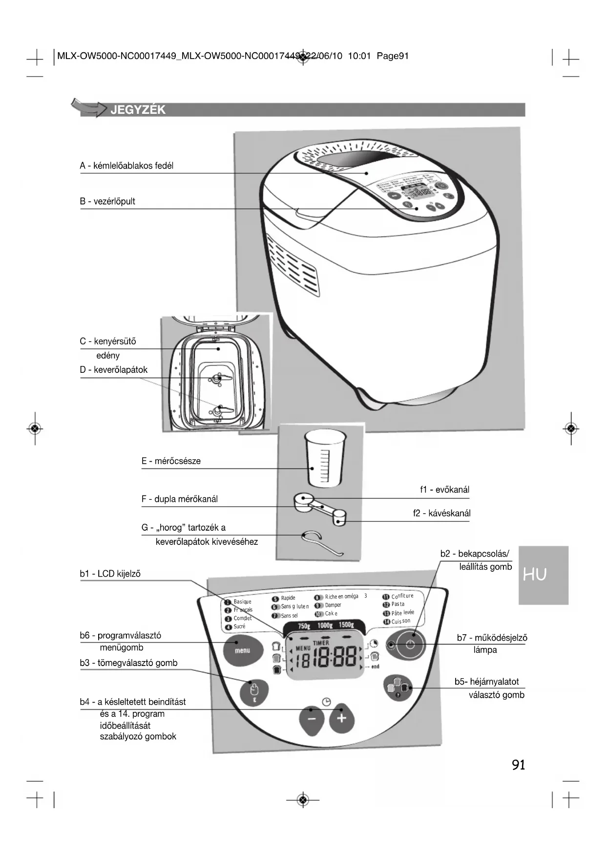 Pâte levée Cuis son A - kémlelőablakos fedél b6 - programválasztó menügomb b4 - a késleltetett beindítást és a 14. program időbeállítását szabályozó gombok b1 - LCD kijelző b3 - tömegválasztó gomb b2 - bekapcsolás/ leállítás gomb b7 - működésjelző lámpa b5- héjárnyalatot választó gomb B - vezérlőpult C - kenyérsütő edény D - keverőlapátok E - mérőcsésze F - dupla mérőkanál f1 - evőkanál f2 - kávéskanál G - „horog” tartozék a keverőlapátok kivevéséhez MLX-OW5000-NC00017449_MLX-OW5000-NC00017449 22/06/10 10:01 Page9192