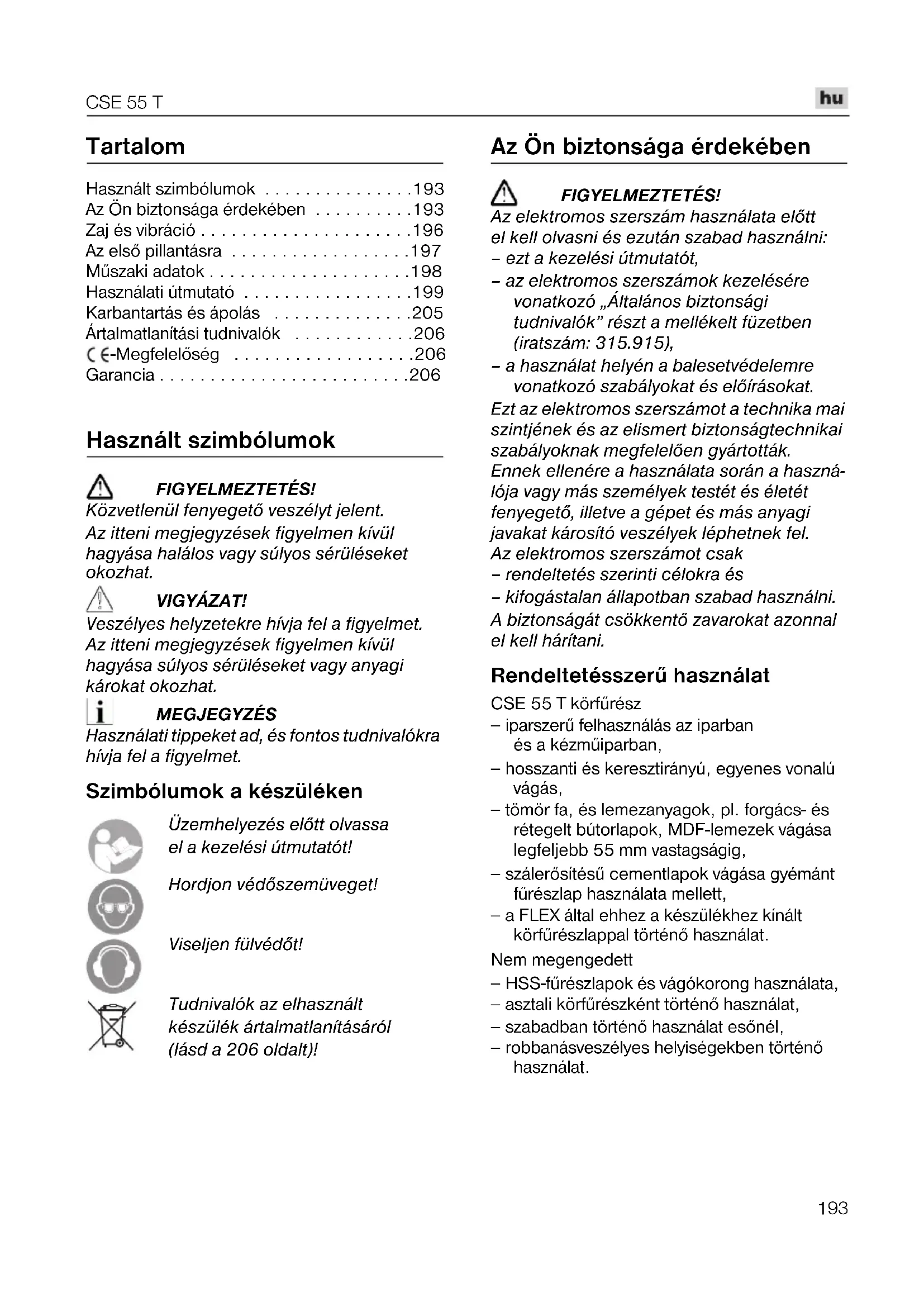 - Garancia Használt szimbólumok FIGYELMEZTETÉS! Közvetlenül fenyegetõ veszélyt jelent. Az itteni megjegyzések figyelmen kívül hagyása halálos vagy súlyos sérüléseket okozhat. VIGYÁZAT! Veszélyes helyzetekre hívja fel a figyelmet. Az itteni megjegyzések figyelmen kívül hagyása súlyos sérüléseket vagy anyagi károkat okozhat. MEGJEGYZÉS Használati tippeket ad, és fontos tudnivalókra hívja fel a figyelmet. Szimbólumok a készüléken Üzemhelyezés elõtt olvassa el a kezelési útmutatót! Hordjon védõszemüveget! Viseljen fülvédõt! Tudnivalók az elhasznált készülék ártalmatlanításáról (lásd a 206 oldalt)! Az Ön biztonsága érdekében FIGYELMEZTETÉS! Az elektromos szerszám használata elõtt el kell olvasni és ezután szabad használni: – ezt a kezelési útmutatót, – az elektromos szerszámok kezelésére vonatkozó „Általános biztonsági tudnivalók” részt a mellékelt füzetben (iratszám: 315.915), – a használat helyén a balesetvédelemre vonatkozó szabályokat és elõírásokat. Ezt az elektromos szerszámot a technika mai szintjének és az elismert biztonságtechnikai szabályoknak megfelelõen gyártották. Ennek ellenére a használata során a haszná- lója vagy más személyek testét és életét fenyegetõ, illetve a gépet és más anyagi javakat károsító veszélyek léphetnek fel. Az elektromos szerszámot csak – rendeltetés szerinti célokra és – kifogástalan állapotban szabad használni. A biztonságát csökkentõ zavarokat azonnal el kell hárítani. Rendeltetésszerû használat CSE 55 T körfûrész – iparszerû felhasználás az iparban és a kézmûiparban, – hosszanti és keresztirányú, egyenes vonalú vágás, – tömör fa, és lemezanyagok, pl. forgács- és rétegelt bútorlapok, MDF-lemezek vágása legfeljebb 55 mm vastagságig, – szálerõsítésû cementlapok vágása gyémánt fûrészlap használata mellett, – a FLEX által ehhez a készülékhez kínált körfûrészlappal történõ használat. Nem megengedett – HSS-fûrészlapok és vágókorong használata, – asztali körfûrészként történõ használat, – szabadban történõ használat esõnél, – robbanásveszélyes helyiségekben történõ használat.CSE 55 T p. 206