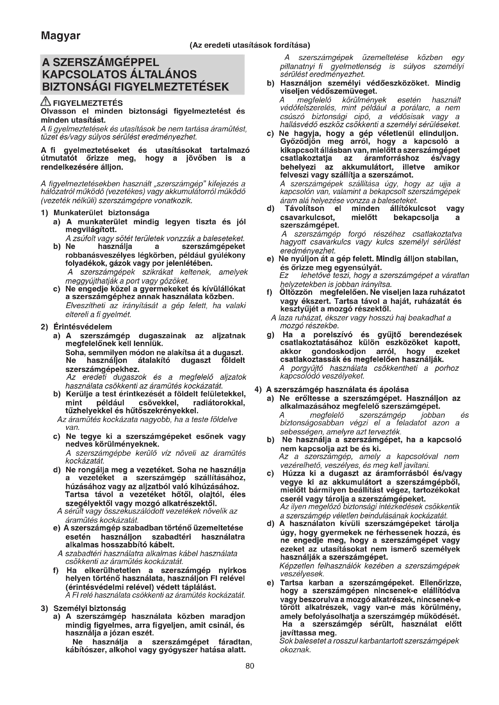 FIGYELMEZTETÉS Olvasson el minden biztonsági fi gyelmeztetést és minden utasítást. A fi gyelmeztetések és utasítások be nem tartása áramütést, tüzet és/vagy súlyos sérülést eredményezhet. A fi gyelmeztetéseket és utasításokat tartalmazó útmutatót őrizze meg, hogy a jövőben is a rendelkezésére álljon. A fi gyelmeztetésekben használt „szerszámgép” kifejezés a hálózatról működő (vezetékes) vagy akkumulátorról működő (vezeték nélküli) szerszámgépre vonatkozik.