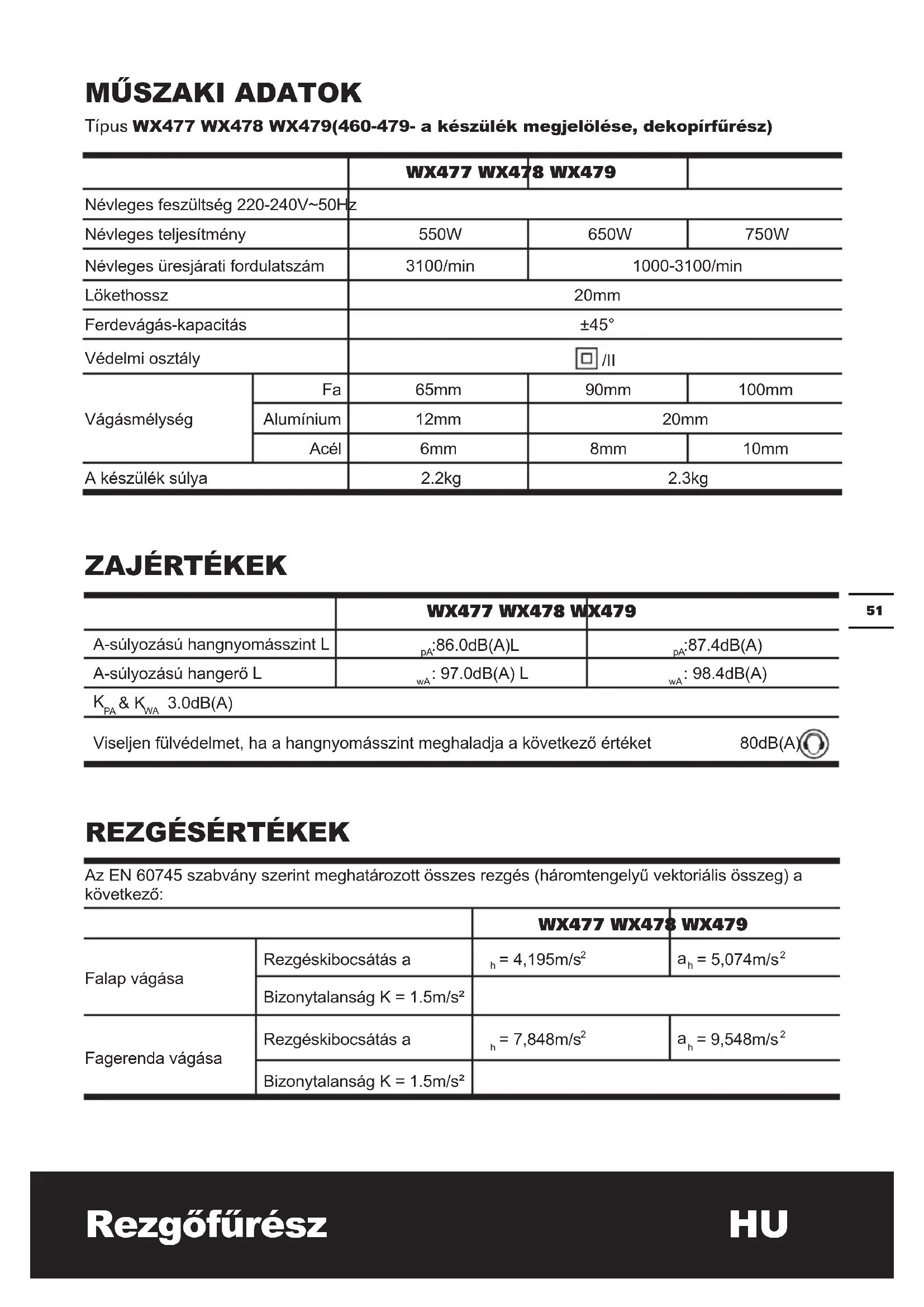 Típus WX477 WX478 WX479(460-479- a készülék megjelölése, dekopírfűrész) WX477 WX478 WX479 Névleges feszültség 220-240V~50Hz Névleges teljesítmény 550W 650W 750W Névleges üresjárati fordulatszám 3100/min 1000-3100/min Lökethossz 20mm Ferdevágás-kapacitás ±45° Védelmi osztály /II Vágásmélység Fa 65mm 90mm 100mm Alumínium 12mm 20mm Acél 6mm 8mm 10mm A készülék súlya 2.2kg 2.3kgRezgőfűrész HU