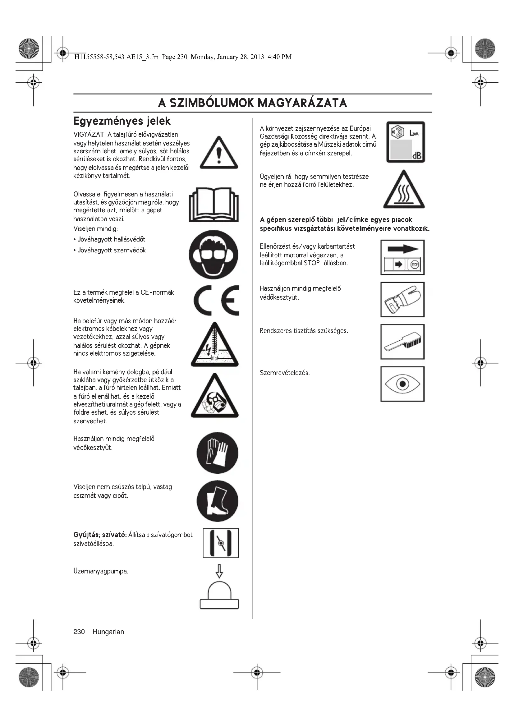 - Jóváhagyott szemvédŒk Ez a termék megfelel a CE-normák követelményeinek. Ha belefúr vagy más módon hozzáér elektromos kábelekhez vagy vezetékekhez, azzal súlyos vagy halálos sérülést okozhat. A gépnek nincs elektromos szigetelése. Ha valami kemény dologba, például sziklába vagy gyökérzetbe ütközik a talajban, a fúró hirtelen leállhat. Emiatt a fúró ellenállhat, és a kezelŒ elveszítheti uralmát a gép felett, vagy a földre eshet, és súlyos sérülést szenvedhet. Használjon mindig megfelelŒ védŒkesztyıt. Viseljen nem csúszós talpú, vastag csizmát vagy cipŒt. Gyújtás; szívató: Állítsa a szívatógombot szívatóállásba. Üzemanyagpumpa. A környezet zajszennyezése az Európai Gazdasági Közösség direktívája szerint. A gép zajkibocsátása a Mıszaki adatok címı fejezetben és a címkén szerepel. Ügyeljen rá, hogy semmilyen testrésze ne érjen hozzá forró felületekhez.