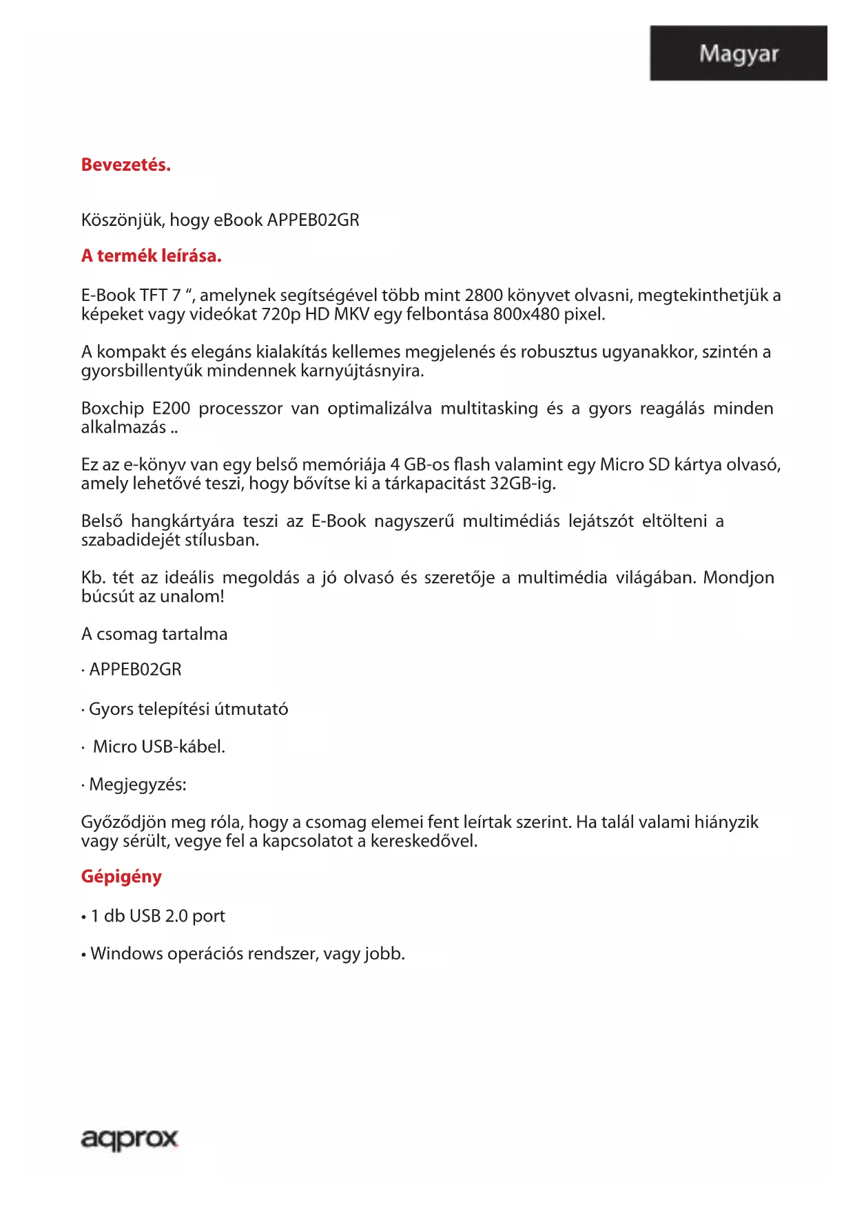 APPEB02GR - Elektronikus olvasó Approx - Ingyenes használati útmutató