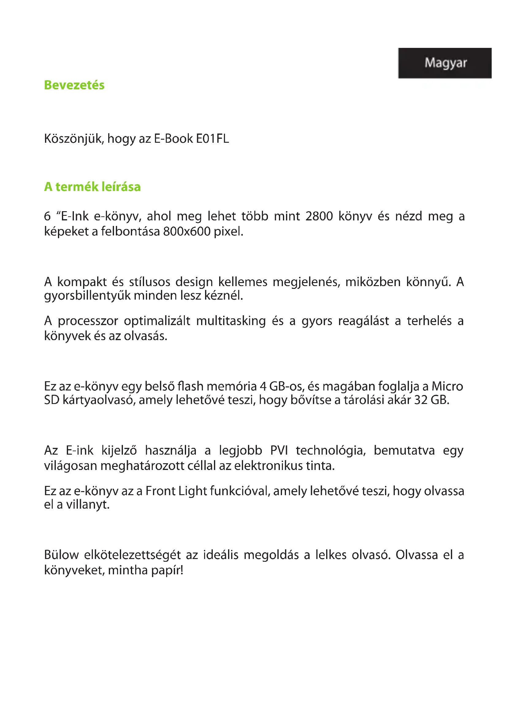Na glavnom izborniku, odaberite Priručnik i pritisnite Enter. Knjiga korisnički priručnik će otvoriti Tehnička Podrška Za više informacija o ovom proizvodu molimo vas da posjetite stranice za podršku na našoj web stranici www.billowtechnology.com ili poslati e-mail na Support@billowtechnology.comBevezetés Köszönjük, hogy az E-Book E01FL A termék leírása 6 “E-Ink e-könyv, ahol meg lehet több mint 2800 könyv és nézd meg a képeket a felbontása 800x600 pixel. A kompakt és stílusos design kellemes megjelenés, miközben könnyű. A gyorsbillentyűk minden lesz kéznél. A processzor optimalizált multitasking és a gyors reagálást a terhelés a könyvek és az olvasás. Ez az e-könyv egy belső ash memória 4 GB-os, és magában foglalja a Micro SD kártyaolvasó, amely lehetővé teszi, hogy bővítse a tárolási akár 32 GB. Az E-ink kijelző használja a legjobb PVI technológia, bemutatva egy világosan meghatározott céllal az elektronikus tinta. Ez az e-könyv az a Front Light funkcióval, amely lehetővé teszi, hogy olvassa el a villanyt. Bülow elkötelezettségét az ideális megoldás a lelkes olvasó. Olvassa el a könyveket, mintha papír!A csomag tartalma -E01FL -Gyors telepítési útmutató -Mini USB kábel Megjegyzés: Győződjön meg arról, hogy a csomag az elemeket a fent leírt. Ha bármilyen elem hiányzik vagy sérült, kérjük, forduljon a forgalmazóhoz. Rendszerkövetelmények -1 USB 2.0 port -Operációs rendszer Windows Alkatrészek leírása