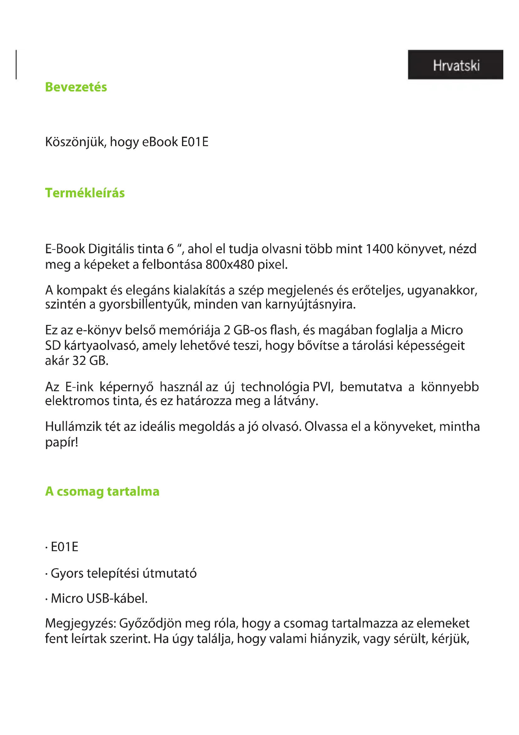- Appuyez sur le bouton Menu pour utiliser le menu option. Soutien S’il vous plaît pour de plus amples renseignements sur l’installation et la conguration de ce produit visitez notre section de support web et billowtechnology.com télécharger le guide complet ou écrire un courriel à l’adresse suivante: support@billowtechnology.comBevezetés Köszönjük, hogy eBook E01E Termékleírás E-Book Digitális tinta 6 “, ahol el tudja olvasni több mint 1400 könyvet, nézd meg a képeket a felbontása 800x480 pixel. A kompakt és elegáns kialakítás a szép megjelenés és erőteljes, ugyanakkor, szintén a gyorsbillentyűk, minden van karnyújtásnyira. Ez az e-könyv belső memóriája 2 GB-os ash, és magában foglalja a Micro SD kártyaolvasó, amely lehetővé teszi, hogy bővítse a tárolási képességeit akár 32 GB. Az E-ink képernyő használ az új technológia PVI, bemutatva a könnyebb elektromos tinta, és ez határozza meg a látvány. Hullámzik tét az ideális megoldás a jó olvasó. Olvassa el a könyveket, mintha papír! A csomag tartalma