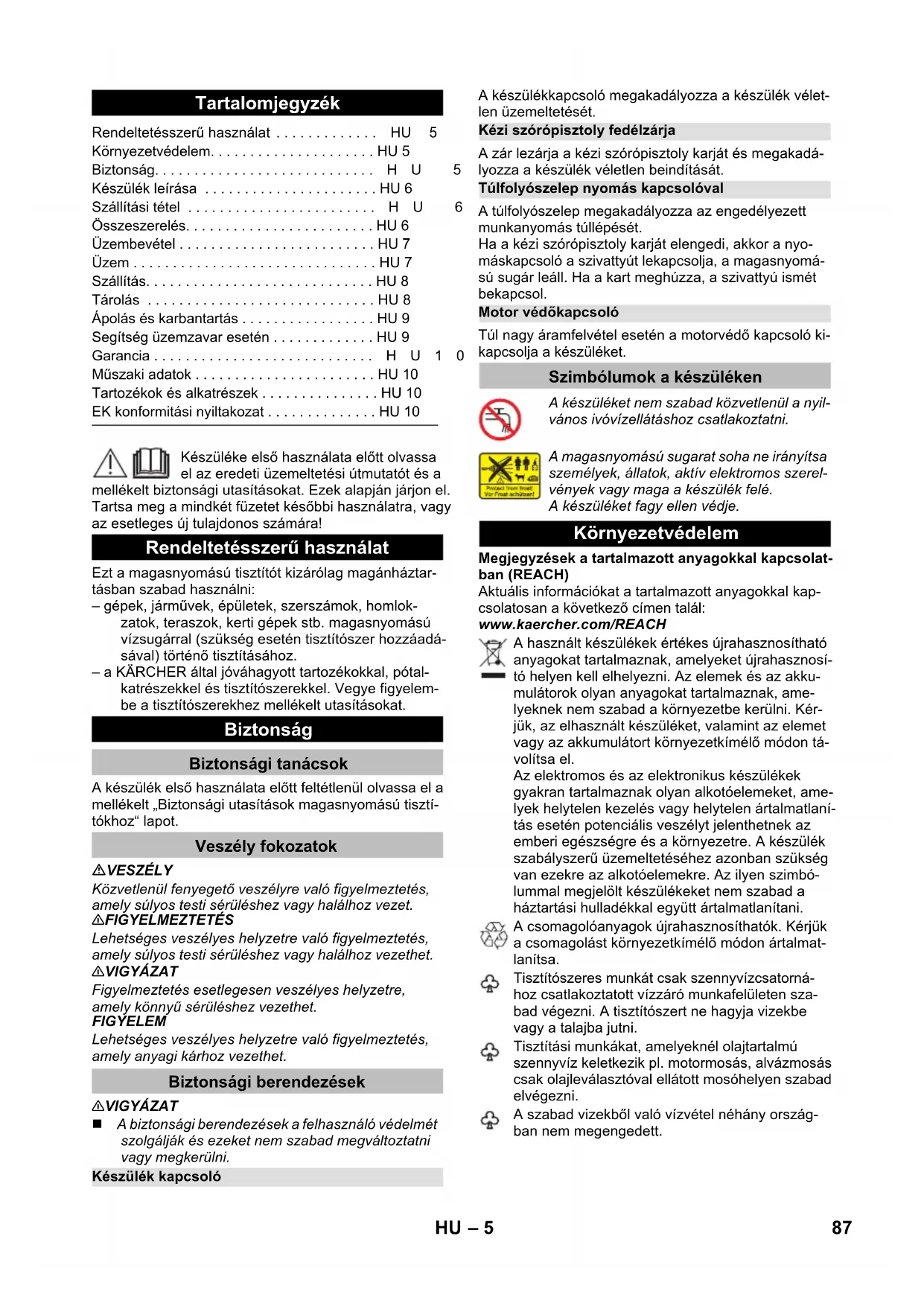 Тип: 1.324-xxx Основные директивы ЕС 2000/14/ЕС 2014/30/EU 2006/42/EC (+2009/127/EC) 2011/65/ЕC Примененные гармонизированные нормы EN 50581 EN 55014–1: 2006+A1: 2009+A2: 2011 EN 55014–2: 1997+A1: 2001+A2: 2008 EN 60335–1 EN 60335–2–79 EN 61000–3–2: 2014 EN 61000–3–3: 2013 EN 62233: 2008 Примененный порядок оценки соответствия 2000/14/ЕС: Приложение V Уровень мощности звука dB(A) Измерено: 89 Гарантировано: 92 Winnenden, 2016/01/01 CEO Head of Approbation 86 RU– 5 Készüléke első használata előtt olvassa el az eredeti üzemeltetési útmutatót és a mellékelt biztonsági utasításokat. Ezek alapján járjon el. Tartsa meg a mindkét füzetet későbbi használatra, vagy az esetleges új tulajdonos számára! Ezt a magasnyomású tisztítót kizárólag magánháztar- tásban szabad használni: – gépek, járművek, épületek, szerszámok, homlok- zatok, teraszok, kerti gépek stb. magasnyomású vízsugárral (szükség esetén tisztítószer hozzáadá- sával) történő tisztításához. – a KÄRCHER által jóváhagyott tartozékokkal, pótal- katrészekkel és tisztítószerekkel. Vegye figyelem- be a tisztítószerekhez mellékelt utasításokat. A készülék első használata előtt feltétlenül olvassa el a mellékelt „Biztonsági utasítások magasnyomású tisztí- tókhoz“ lapot. VESZÉLY Közvetlenül fenyegető veszélyre való figyelmeztetés, amely súlyos testi sérüléshez vagy halálhoz vezet. 몇 FIGYELMEZTETÉS Lehetséges veszélyes helyzetre való figyelmeztetés, amely súlyos testi sérüléshez vagy halálhoz vezethet. 몇 VIGYÁZAT Figyelmeztetés esetlegesen veszélyes helyzetre, amely könnyű sérüléshez vezethet. FIGYELEM Lehetséges veszélyes helyzetre való figyelmeztetés, amely anyagi kárhoz vezethet. 몇 VIGYÁZAT A biztonsági berendezések a felhasználó védelmét szolgálják és ezeket nem szabad megváltoztatni vagy megkerülni. A készülékkapcsoló megakadályozza a készülék vélet- len üzemeltetését. A zár lezárja a kézi szórópisztoly karját és megakadá- lyozza a készülék véletlen beindítását. A túlfolyószelep megakadályozza az engedélyezett munkanyomás túllépését. Ha a kézi szórópisztoly karját elengedi, akkor a nyo- máskapcsoló a szivattyút lekapcsolja, a magasnyomá- sú sugár leáll. Ha a kart meghúzza, a szivattyú ismét bekapcsol. Túl nagy áramfelvétel esetén a motorvédő kapcsoló ki- kapcsolja a készüléket. Megjegyzések a tartalmazott anyagokkal kapcsolat- ban (REACH) Aktuális információkat a tartalmazott anyagokkal kap- csolatosan a következő címen talál: www.kaercher.com/REACH Tartalomjegyzék Rendeltetésszerű használat . . . . . . . . . . . . . HU 5 Környezetvédelem. . . . . . . . . . . . . . . . . . . . . HU 5 Biztonság. . . . . . . . . . . . . . . . . . . . . . . . . . . .HU 5 Készülék leírása . . . . . . . . . . . . . . . . . . . . . . HU 6 Szállítási tétel . . . . . . . . . . . . . . . . . . . . . . . .HU 6 Összeszerelés. . . . . . . . . . . . . . . . . . . . . . . . HU 6 Üzembevétel . . . . . . . . . . . . . . . . . . . . . . . . . HU 7 Üzem . . . . . . . . . . . . . . . . . . . . . . . . . . . . . . . HU 7 Szállítás. . . . . . . . . . . . . . . . . . . . . . . . . . . . . HU 8 Tárolás . . . . . . . . . . . . . . . . . . . . . . . . . . . . . HU 8 Ápolás és karbantartás . . . . . . . . . . . . . . . . . HU 9 Segítség üzemzavar esetén . . . . . . . . . . . . . HU 9 Garancia . . . . . . . . . . . . . . . . . . . . . . . . . . . .HU10 Műszaki adatok . . . . . . . . . . . . . . . . . . . . . . . HU 10 Tartozékok és alkatrészek . . . . . . . . . . . . . . . HU 10 EK konformitási nyiltakozat . . . . . . . . . . . . . . HU 10 Rendeltetésszerű használat Biztonság Biztonsági tanácsok Veszély fokozatok Biztonsági berendezések Készülék kapcsoló Kézi szórópisztoly fedélzárja Túlfolyószelep nyomás kapcsolóval Motor védőkapcsoló Szimbólumok a készüléken A készüléket nem szabad közvetlenül a nyil- vános ivóvízellátáshoz csatlakoztatni. A magasnyomású sugarat soha ne irányítsa személyek, állatok, aktív elektromos szerel- vények vagy maga a készülék felé. A készüléket fagy ellen védje. Környezetvédelem A használt készülékek értékes újrahasznosítható anyagokat tartalmaznak, amelyeket újrahasznosí- tó helyen kell elhelyezni. Az elemek és az akku- mulátorok olyan anyagokat tartalmaznak, ame- lyeknek nem szabad a környezetbe kerülni. Kér- jük, az elhasznált készüléket, valamint az elemet vagy az akkumulátort környezetkímélő módon tá- volítsa el. Az elektromos és az elektronikus készülékek gyakran tartalmaznak olyan alkotóelemeket, ame- lyek helytelen kezelés vagy helytelen ártalmatlaní- tás esetén potenciális veszélyt jelenthetnek az emberi egészségre és a környezetre. A készülék szabályszerű üzemeltetéséhez azonban szükség van ezekre az alkotóelemekre. Az ilyen szimbó- lummal megjelölt készülékeket nem szabad a háztartási hulladékkal együtt ártalmatlanítani. A csomagolóanyagok újrahasznosíthatók. Kérjük a csomagolást környezetkímélő módon ártalmat- lanítsa. Tisztítószeres munkát csak szennyvízcsatorná- hoz csatlakoztatott vízzáró munkafelületen sza- bad végezni. A tisztítószert ne hagyja vizekbe vagy a talajba jutni. Tisztítási munkákat, amelyeknél olajtartalmú szennyvíz keletkezik pl. motormosás, alvázmosás csak olajleválasztóval ellátott mosóhelyen szabad elvégezni. A szabad vizekből való vízvétel néhány ország- ban nem megengedett. 87HU– 6 Jelen használati útmutatóban a maximális felszereltség van leírva. A szállítási terjedelem modellenként eltérő (lásd a csomagoláson). Az ábr