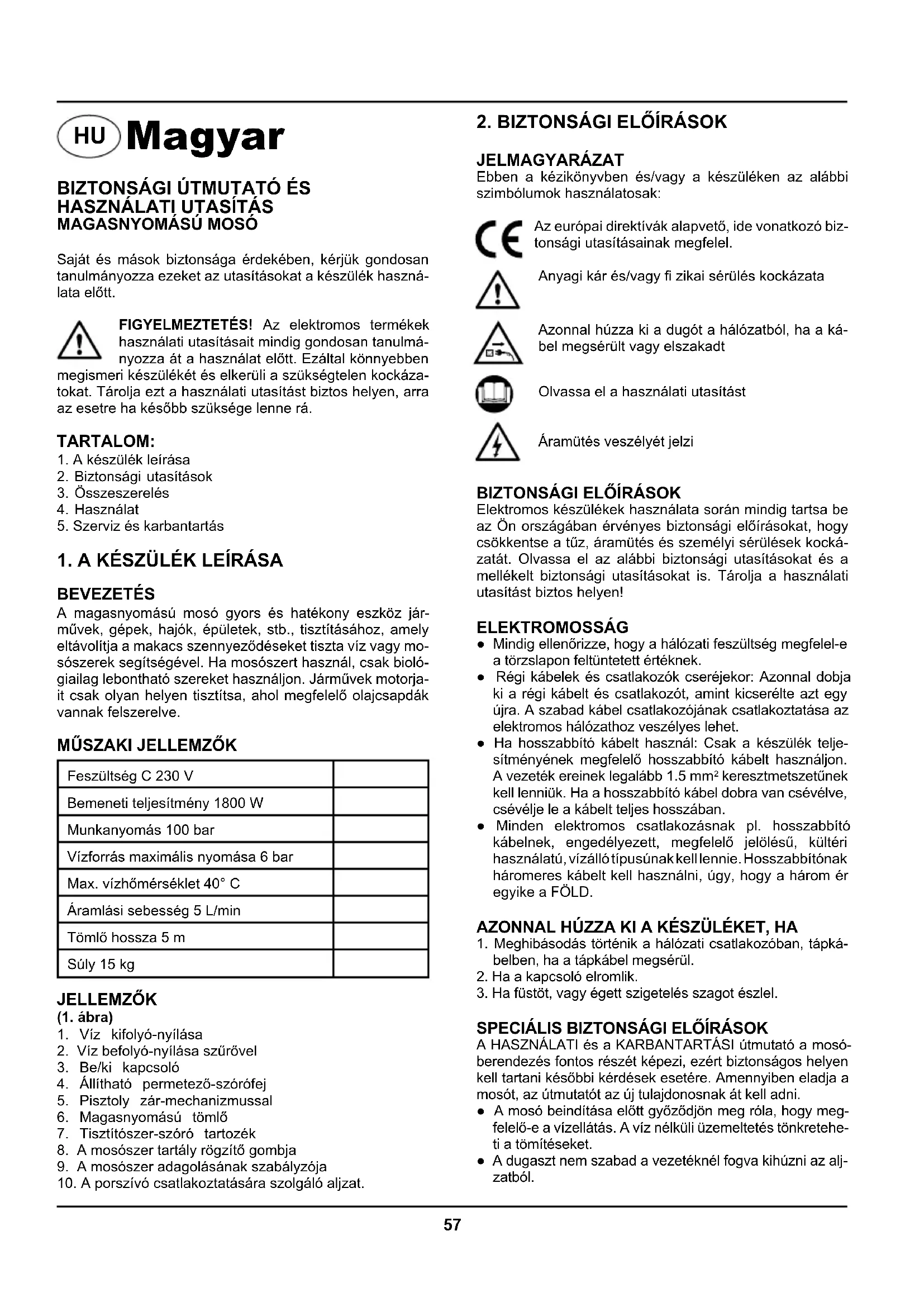 BEVEZETÉS A magasnyomású mosó gyors és hatékony eszköz jár- mvek, gépek, hajók, épületek, stb., tisztításához, amely eltávolítja a makacs szennyezdéseket tiszta víz vagy mo- sószerek segítségével. Ha mosószert használ, csak bioló- giailag lebontható szereket használjon. Jármvek motorja- it csak olyan helyen tisztítsa, ahol megfelel olajcsapdák vannak felszerelve. MSZAKI JELLEMZK Feszültség C 230 V Bemeneti teljesítmény 1800 W Munkanyomás 100 bar Vízforrás maximális nyomása 6 bar Max. vízhmérséklet 40° C Áramlási sebesség 5 L/min Töml hossza 5 m Súly 15 kg JELLEMZK (1. ábra)
