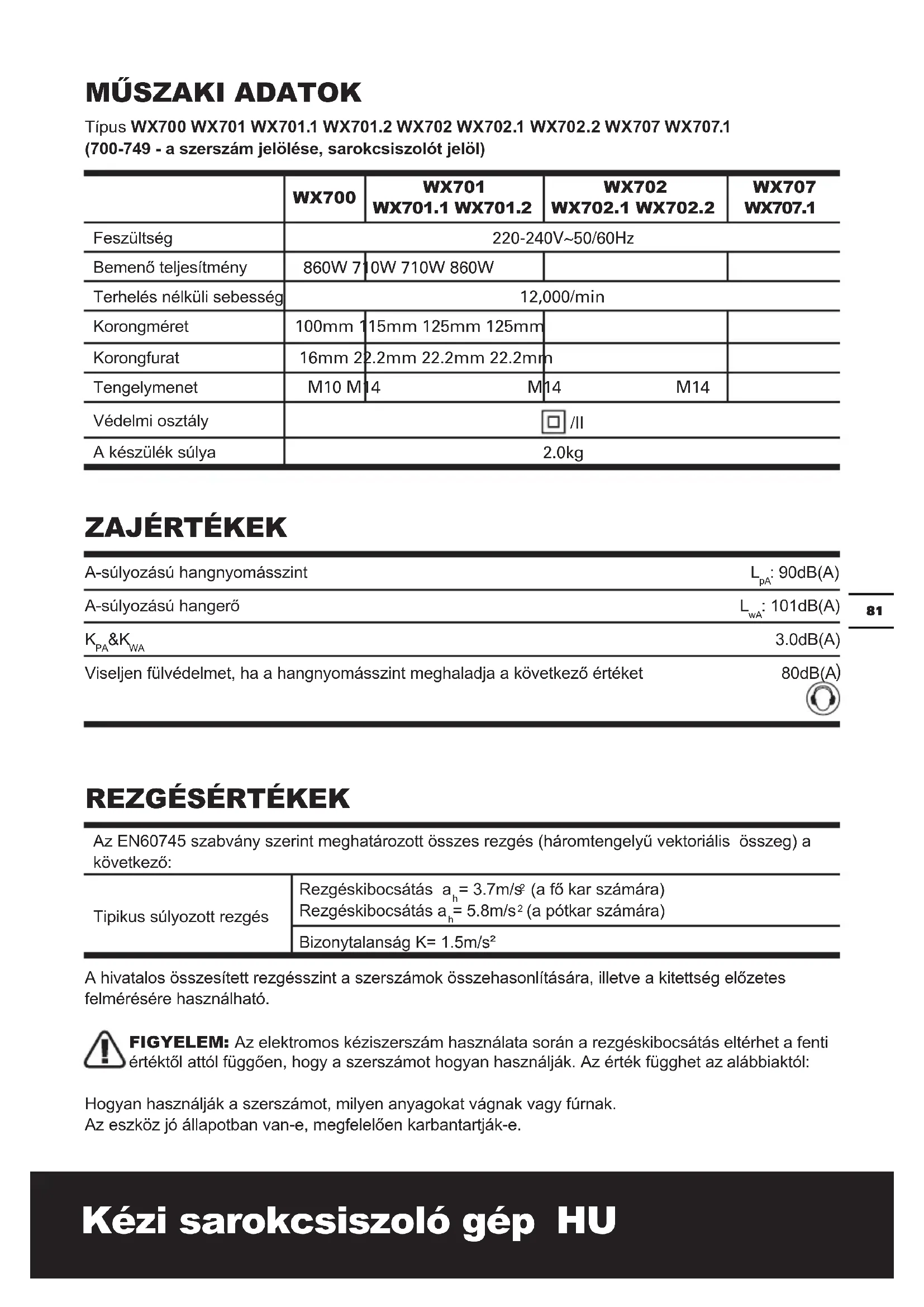 Típus WX700 WX701 WX701.1 WX701.2 WX702 WX702.1 WX702.2 WX707 WX707.1 (700-749 - a szerszám jelölése, sarokcsiszolót jelöl)