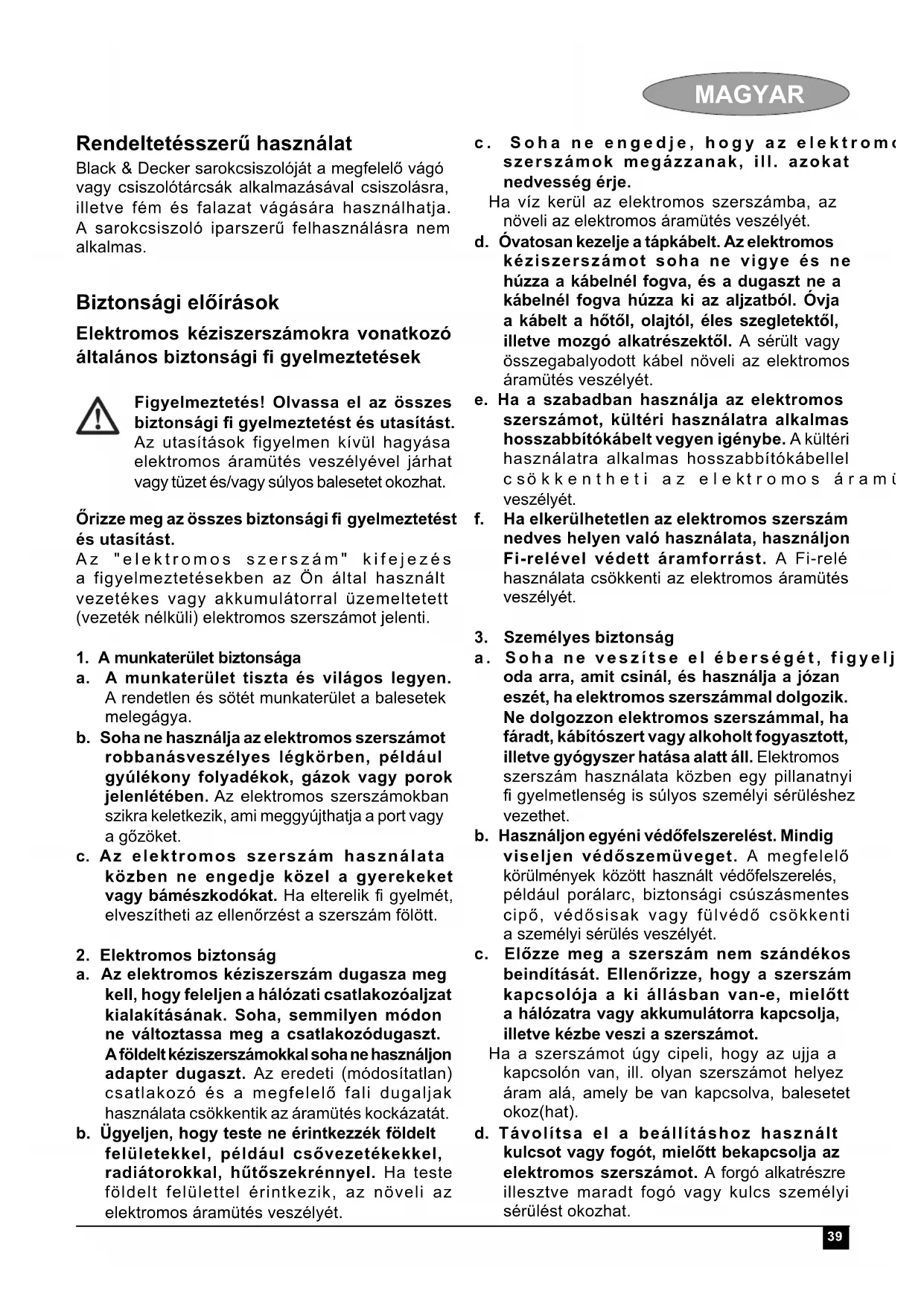 MAGYAR Összeszerelés Figyelmeztetés! Összeszerelés előtt ellenőrizze, hogy a szerszám ki van-e kapcsolva, és ki van-e húzva a konnektorból. A védőburkolat fel- és leszerelése (A & B ábra) A szerszám kizárólag köszörülési munkákhoz alkalmazható védőburkolattal rendelkezik. Ha vágási műveletet végez vele, ehhez megfelelő védőburkolatot kell felszerelnie. A vágási műveletekhez alkalmas védőburkolat cikkszáma: 1004484-00, a Black & Decker szervizekben szerezhető be. Felszerelés Helyezze a szerszámot egy asztalra a kihajtótengelyel (5) fölfelé. Helyezze a rugós alátétet (6) a kihajtótengelyre és helyezze el a felfekvő felületen (7). Tegye a védőburkolatot (4) a szerszámra az ábra szerint Helyezze a karimát (8) a kihajtótengelyre úgy, hogy a kiemelkedések a védőburkolat felé nézzenek. Ellenőrizze, hogy a felfekvő felület furatai egyvonalba esnek a csavarok helyével a karimán. Rögzítse a karimát a csavarokkal (9). Ellenőrizze, hogy a csavarok teljesen meg vannak-e húzva és hogy a védőburkolatotot el lehet-e fordítani. Eltávolítás Csavarhúzóval hajtsa ki a csavarokat (9). Vegye le a karimát (8), a védőburkolatot (4) és a rugós alátétet (7). Tárolja gondosan őket. Figyelmeztetés! Soha ne használja a szerszámot védőburkolat nélkül. Az oldalfogantyú felszerelése Csavarja be az oldalfogantyút (2) a szerszám egyik e célt szolgáló furatába. Figyelmeztetés! Mindig használja az oldalfogantyút. A csiszoló és a vágókorongok fel- és leszerelése (C -E ábra) Mindig a célnak megfelelő korongot alkalmazza. Mindig a megfelelő belső és külső átmérőjű korongot használjon (lásd a műszaki adatokat). Felszerelés Az előbbiek szerint szerelje fel a védőburkolatot. Helyezze fel a belső karimát (10) a tengelyre (5) az itt bemutatott módon (C ábra). Ellenőrizze, hogy a karima helyesen van elhelyezve a tengely lapos oldalán. Helyezze fel a korongot (11) a tengelyre (5) az itt bemutatott módon (C ábra). Ha a korong középső része kiemelkedik (12), ellenőrizze, hogy a kiemelkedő rész befelé néz-e. Ellenőrizze, hogy a korong megfelelően van-e elhelyezve a belső karimán. Tegye a külső karimát (13) a tengelyre. Amikor csiszolókorongot szerel fel, a külső karima kiemelt középső része a korong felé kell, hogy nézzen (D ábra A). Amikor vágókorongot szerel fel, a külső karima kiemelt középső része a koronggal ellentétes irányba kell, hogy nézzen (B ábra D). Tartsa lenyomva a tengelyrögzítőt (3) és szorítsa rá a külső karimát a körmöskulccsal (14) (E ábra). Eltávolítás Tartsa lenyomva a tengelyrögzítőt (3) és lazítsa meg a külső karimát (13) a körmöskulccsal (14) (E ábra). Vegye le a karimát (13) és a korongot (11). A csiszolókorong fel- és leszerelése (E & F ábra) Csiszoláshoz csiszolótányérra van szükség. A csiszolótányér megvásárolható Black & Decker kereskedőjénél mint tartozék. Felszerelés Helyezze fel a belső karimát (10) a tengelyre (5) az itt bemutatott módon (F ábra). Ellenőrizze, hogy a karima helyesen van elhelyezve a tengely lapos oldalán. Tegye a csiszolótányért (15) a tengelyre. Tegye a csiszolókorongot (16) a csiszolótányérra. Helyezze a külső karimát (13) a tengelyre úgy, hogy a kiemelkedő középső rész a koronggal ellentétes irányba nézzen. Tartsa lenyomva a tengelyrögzítőt (3) és szorítsa rá a külső karimát a körmöskulccsal (14) (E ábra). Ellenőrizze, hogy a külső karima helyesen van-e elhelyezve és a csiszolókorong erősen be van-e szorítva. Eltávolítás Tartsa lenyomva a tengelyrögzítőt (3) és lazítsa meg a külső karimát (13) a körmöskulccsal (14) (E ábra). Vegye le a külső karimát (13), a csiszolókorongot (16) és az csiszolótányért (15). Maradványkockázatok A biztonsági fi gyelmeztetésekben ismertetett kocká- zatok mellett más kockázatok is jellemezhetik a sz- erszám használatát. Ezek a kockázatok a szerszám rendeltetéstől eltérő, huzamos, stb. használatából adódhatnak. Még a vonatkozó biztonsági utasítások45 MAGYAR betartása és a védőeszközök alkalmazása mellett sem kerülhetők el bizonyos maradványkockázatok. Ezek például a következők: A forgó/mozgó alkatrészek megérintése által okozott sérülés. Az alkatrészek, vágólapok, tartozékok cseréje által okozott sérülés. A szerszám huzamos használata által okozott egészségkárosodás. Bármely szerszám huza- mosabb ideig való használata esetén tartson rendszeres munkaszüneteket. Halláskárosodás. A szerszám használata közben keletkezett por belégzése miatti egészségkárosodás (például famunkáknál, különös tekintettel a tölgy, bükk és MDF anyagokra). Használat Figyelmeztetés! Hagyja a szerszámot saját tempójában működni. Ne terhelje túl. Óvatosan vezesse a kábelt, nehogy véletlenül elvágja. Készüljön fel arra, hogy amikor a köszörülő- vagy vágókorong hozzáér a munkadarabhoz, szikrázást tapasztal. Mindig úgy irányítsa a szerszámot, hogy a védőburkolat optimálisan védje a köszörülő- vagy vágókorongtól. Ki- és bekapcsolás Bekapcsoláshoz tolja előre a ki/be kapcsológombot (1). Megjegyzendő, hogy a szerszám a gomb felengedése után tovább forog. Kikapcsoláshoz nyomja le a ki/be kapcsológomb hátsó részét. Figyelmeztetés! Soha ne kapcsolja ki a gépet terhelés közben. Javaslatok az optimális használathoz Egyik kezével erősen tartsa a szerszámot az oldalfogantyúnál, a másikkal pedig a főfogantyúnál. Köszörüléskor mindig kb. 15° -os szögben tartsa a szerszámot a munkadarabhoz. Karbantartás Az Ön Black & Decker szerszámát minimális karban- tartás melletti hosszú távú használatra terveztük. A folyamatos kielégítő működés feltétele a megfelelő gondozás és rendszeres tisztítás. Figyelmeztetés! A hálózati/ 