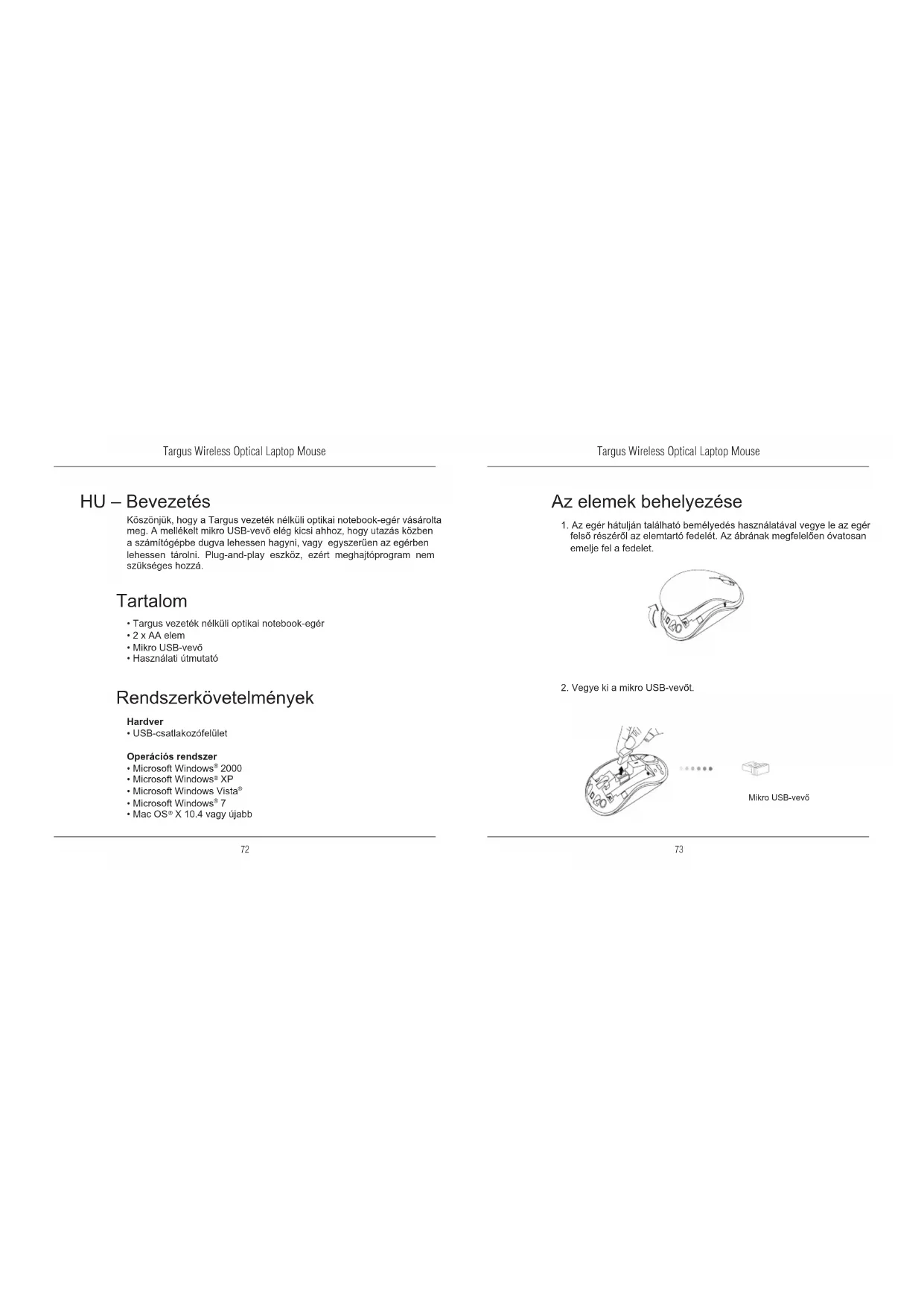 HU – Bevezetés Köszönjük, hogy a Targus vezeték nélküli optikai notebook-egér vásárolta meg. A mellékelt mikro USB-vevő elég kicsi ahhoz, hogy utazás közben a számítógépbe dugva lehessen hagyni, vagy egyszerűen az egérben lehessen tárolni. Plug-and-play eszköz, ezért meghajtóprogram nem szükséges hozzá. Rendszerkövetelmények Hardver