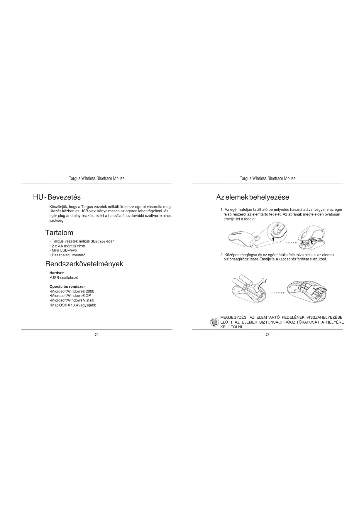 HU - Bevezetés Köszönjük, hogy a Targus vezeték nélküli Bluetrace egeret vásárolta meg. Utazás közben az USB-vevt kényelmesen az egéren lehet rögzíteni. Az egér plug and play eszköz, ezért a haszálatához további szoftverre nincs szükség. Rendszerkövetelmények Hardver