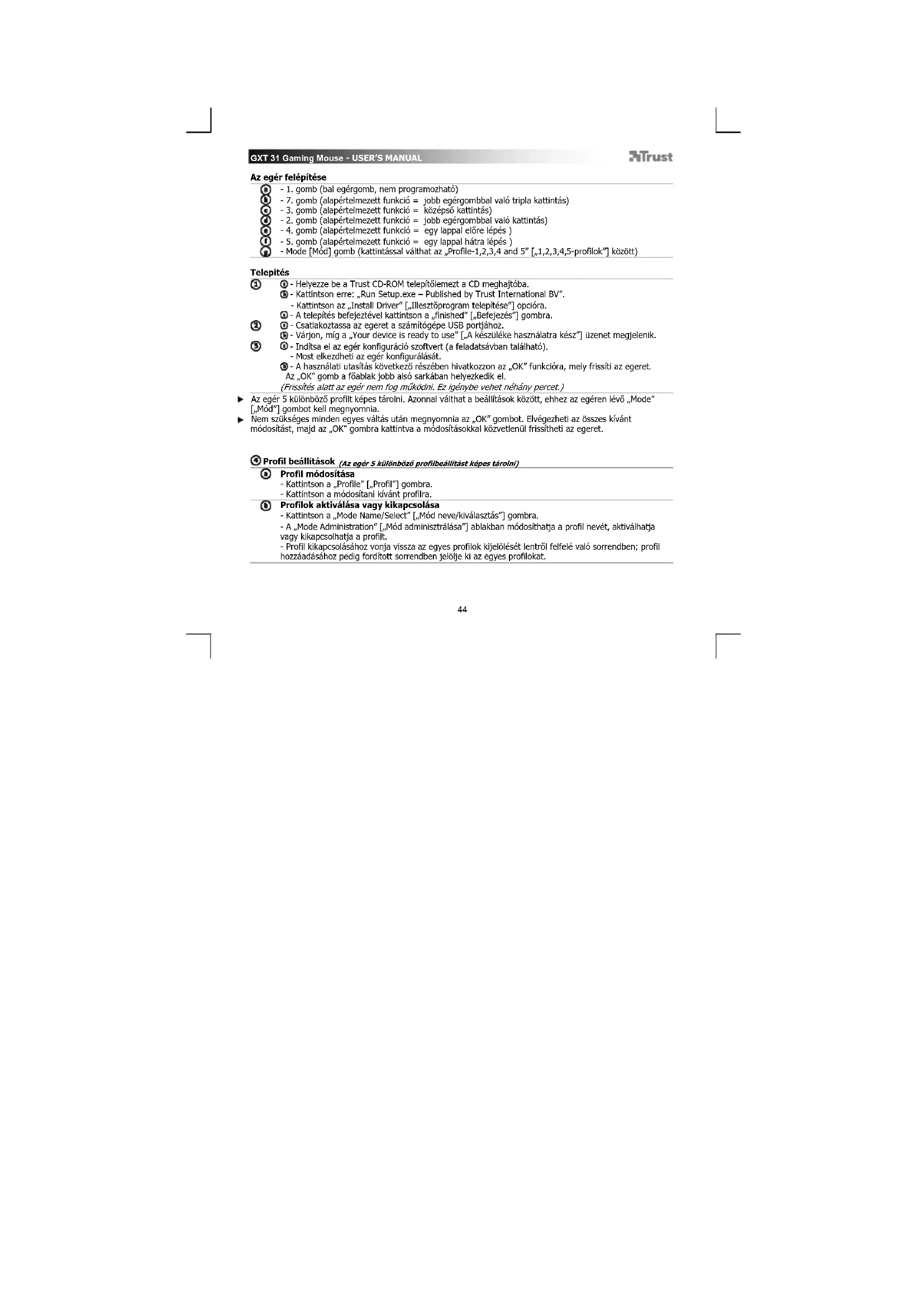 - Helyezze be a Trust CD-ROM telepítőlemezt a CD meghajtóba. - Kattintson erre: „Run Setup.exe – Published by Trust International BV”. - Kattintson az „Install Driver” [„Illesztõprogram telepítése”] opcióra. - A telepítés befejeztével kattintson a „finished” [„Befejezés”] gombra. - Csatlakoztassa az egeret a számítógépe USB portjához. - Várjon, míg a „Your device is ready to use” [„A készüléke használatra kész”] üzenet megjelenik. - Indítsa el az egér konfiguráció szoftvert (a feladatsávban található). - Most elkezdheti az egér konfigurálását. - A használati utasítás következő részében hivatkozzon az „OK” funkcióra, mely frissíti az egeret. Az „OK” gomb a főablak jobb alsó sarkában helyezkedik el. (Frissítés alatt az egér nem fog működni. Ez igénybe vehet néhány percet.) Az egér 5 különböző profilt képes tárolni. Azonnal válthat a beállítások között, ehhez az egéren lévő „Mode” [„Mód”] gombot kell megnyomnia. Nem szükséges minden egyes váltás után megnyomnia az „OK” gombot. Elvégezheti az összes kívánt módosítást, majd az „OK” gombra kattintva a módosításokkal közvetlenül frissítheti az egeret.