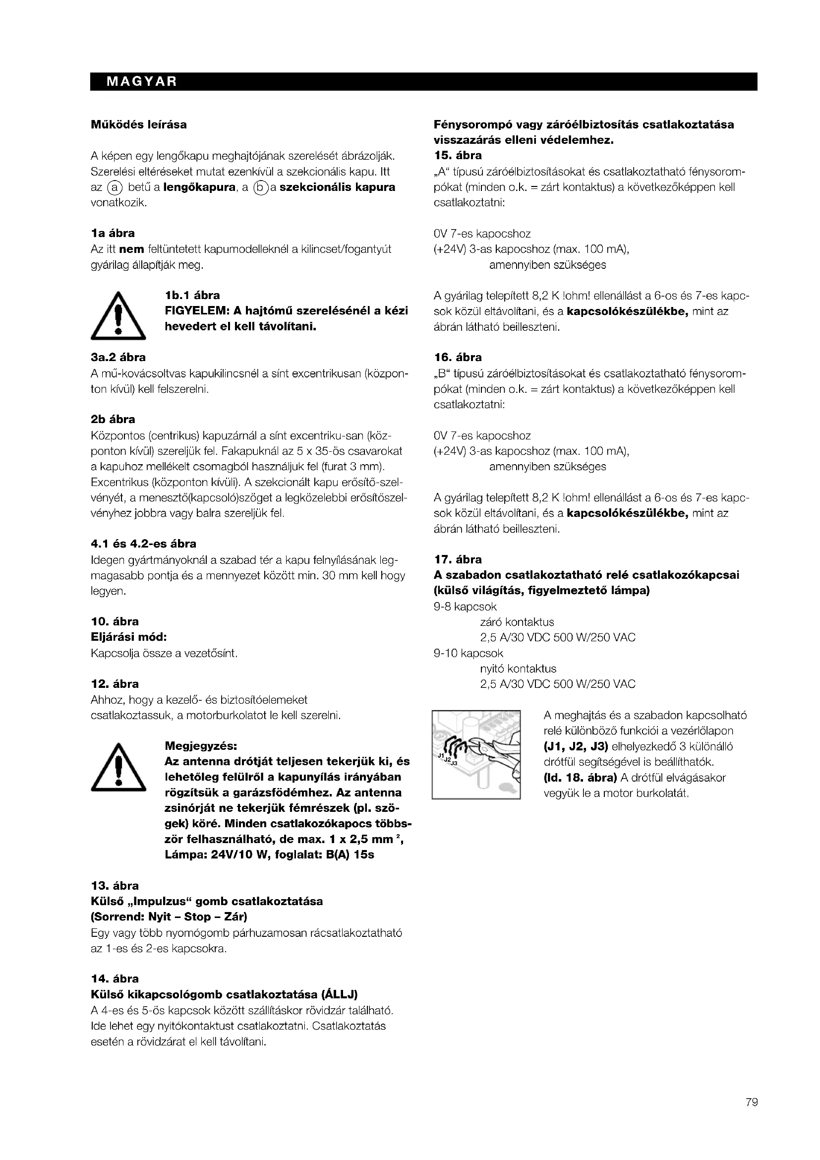 sután megszakítás nélkül. Amennyiben ez nem sikerült, a „Zár“ potmétert állítsuk egy magasabb értékre, ehhez az adatokat törölni kell, és újból egy üzembehelyezést kell véghezvinni. Ezt köve- tŒen a készülék üzemképes. Áramkimaradás utáni üzemeltetés Áramszünet után az eltárolt adatok nem vésznek el. Az elsŒ mıködés mindig NYITÓ referenciaút villogó motorvilágítással. Fontos, hogy az összekötŒelem a vezetŒszánba be legyen kap- csolva. Ha nem ez történne, az összekötŒelem a motortárc- sának ütközne és rossz refernciapontra állna be. Ha ez mégis bekövetkezne, akkor indítsa el a meghajtást a KAPU ZÁR irányba, hogy az összekötŒelem be tudja kötni a vezetŒszánba. Miután a meghajtást levette a hálózatról, vigye újból véghez a NYIT referenciautat. A meghajtás és a szabadon kapcsolható relé funkciói a meghajtásnak nincs egyedi funkciója (gyári beállítás) – a relé behúz a motorvilágítással, de villogás nélkül a meghajtásnak nincs egyedi funkciója – a relé behúz a ZÁR végállás elérésekor (’KAPU-ZÁR’ – jelzés) Automatikus zárás a NYIT végállásból 30 sec. késleltetési idŒ és 2 sec. figyelmeztetési idŒ után – a relé tartósan behúz, mind a késleltetési, mind a figyelmeztetési idŒ és mıködtetés során Automatikus zárás a NYIT végállásból 30 sec. késleltetési idŒ és 2 sec. figyelmeztetési idŒ után – a relé lassan villog a késleltetés során, gyorsan villog a figyelmeztetési idŒ alatt; mıködéskor pedig normál villogás figyelmeztetési idŒ aktiválva (2 sec.) – a relé tartósan behúz a figyelmeztetési idŒ, illetve a kapumıködés alatt figyelmeztetési idŒ aktiválva (2 sec.) – a relé gyorsan villog a figyelmeztetési idŒ alatt, illetve normál villogás kapumıködés közben figyelmeztetési idŒ aktiválva (2 sec.) – automatikus zárás NYIT végállásból 30 sec. kés- leltetési és 2 sec. figyelmeztetési idŒ után – a relé tartósan behúz a késleltetés, a figyelmez- tetési idŒ és a kapumıködés közben figyelmeztetési idŒ aktiválva (2 sec.) – automatikus zárás NYIT végállásból 30 sec. kés- leltetési és 2 sec. figyelmeztetési idŒ után – a relé a késleltetés alatt lassan, a figyelmeztetési idŒ alatt gyorsan villog; kapumıködés közben normál villogás Késleltetés: Várakozási idŒ a KAPU NYIT végállásban. Ez idŒ alatti impulzu- sadás újból indítja a késleltetést. Figyelmeztetési idŒ: A parancsadás és a kapumıködés közötti idŒ. Ez alatt az idŒ alatt történŒ újbóli parancsadás esetén a figyelmeztetési idŒ lejár. Automatikus zárás: Meghatározott idŒvel a KAPU NYIT végállás elérése után a kapu automatikusan bezáródik. Biztonsági okok miatt az automatikus zárás aktiválásakor java- soljuk a fénysorompót vagy záróél-biztosítást.