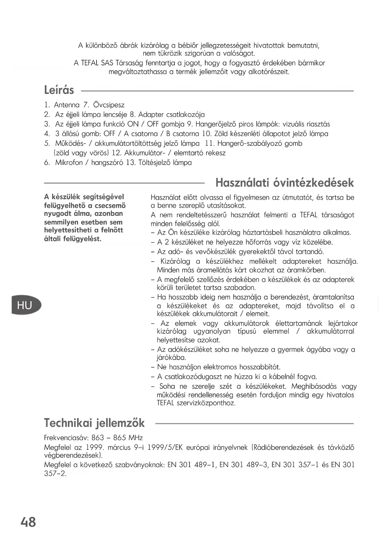 Használati óvintézkedések Használat előtt olvassa el figyelmesen az útmutatót, és tartsa be a benne szereplő utasításokat. A nem rendeltetésszerű használat felmenti a TEFAL társaságot minden felelősség alól. – Az Ön készüléke kizárólag háztartásbeli használatra alkalmas. – A 2 készüléket ne helyezze hőforrás vagy víz közelébe. – Az adó- és vevőkészülék gyerekektől távol tartandó. – Kizárólag a készülékhez mellékelt adaptereket használja. Minden más áramellátás kárt okozhat az áramkörben. – A megfelelő szellőzés érdekében a készülékek és az adapterek körüli területet tartsa szabadon. – Ha hosszabb ideig nem használja a berendezést, áramtalanítsa a készülékeket és az adaptereket, majd távolítsa el a készülékek akkumulátorait / elemeit. – Az elemek vagy akkumulátorok élettartamának lejártakor kizárólag ugyanolyan típusú elemmel / akkumulátorral helyettesítse azokat. – Az adókészüléket soha ne helyezze a gyermek ágyába vagy a járókába. – Ne használjon elektromos hosszabbítót. – A csatlakozódugaszt ne húzza ki a kábelnél fogva. – Soha ne szerelje szét a készülékeket. Meghibásodás vagy működési rendellenesség esetén forduljon mindig egy hivatalos TEFAL szervizközponthoz. Technikai jellemzők Frekvenciasáv: 863 – 865 MHz Megfelel az 1999. március 9–i 1999/5/EK európai irányelvnek (Rádióberendezések és távközlő végberendezések). Megfelel a következő szabványoknak: EN 301 489–1, EN 301 489–3, EN 301 357–1 és EN 301 357–2. A készülék segítségével felügyelhető a csecsemő nyugodt álma, azonban semmilyen esetben sem helyettesítheti a felnőtt általi felügyelést. TefDis-Veille BB EDG 08-10 26/07/10 16:43 Page 4849
