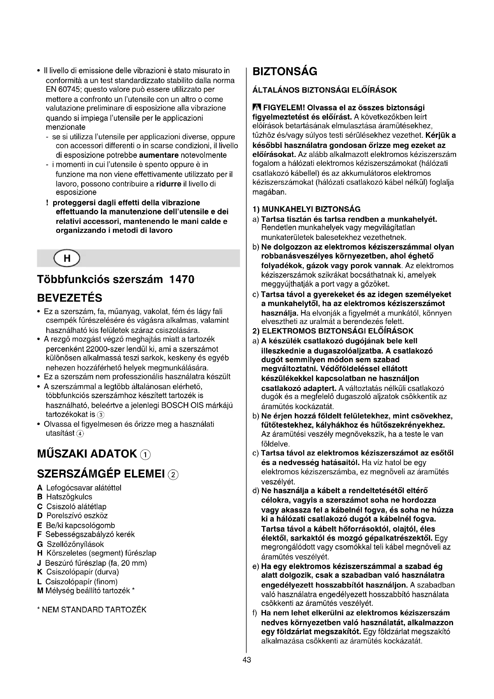 - Az EN 60745 alapján végzett mérések szerint ezen készülék hangnyomás szintje 92 dB(A) a hangteljesítmény szintje 103 dB(A) (normál eltérés: 3 dB), a rezgésszám ✱ m/s² (a három irány vektorösszege; szórás K = 1,5 m/s²) ✱ csiszolás közben 8,8 m/s² ✱ vágásahoz beszúró fűrészlappal 13,9 m/s² ✱ vágásahoz körszeletes fűrészlappal 7,2 m/s²