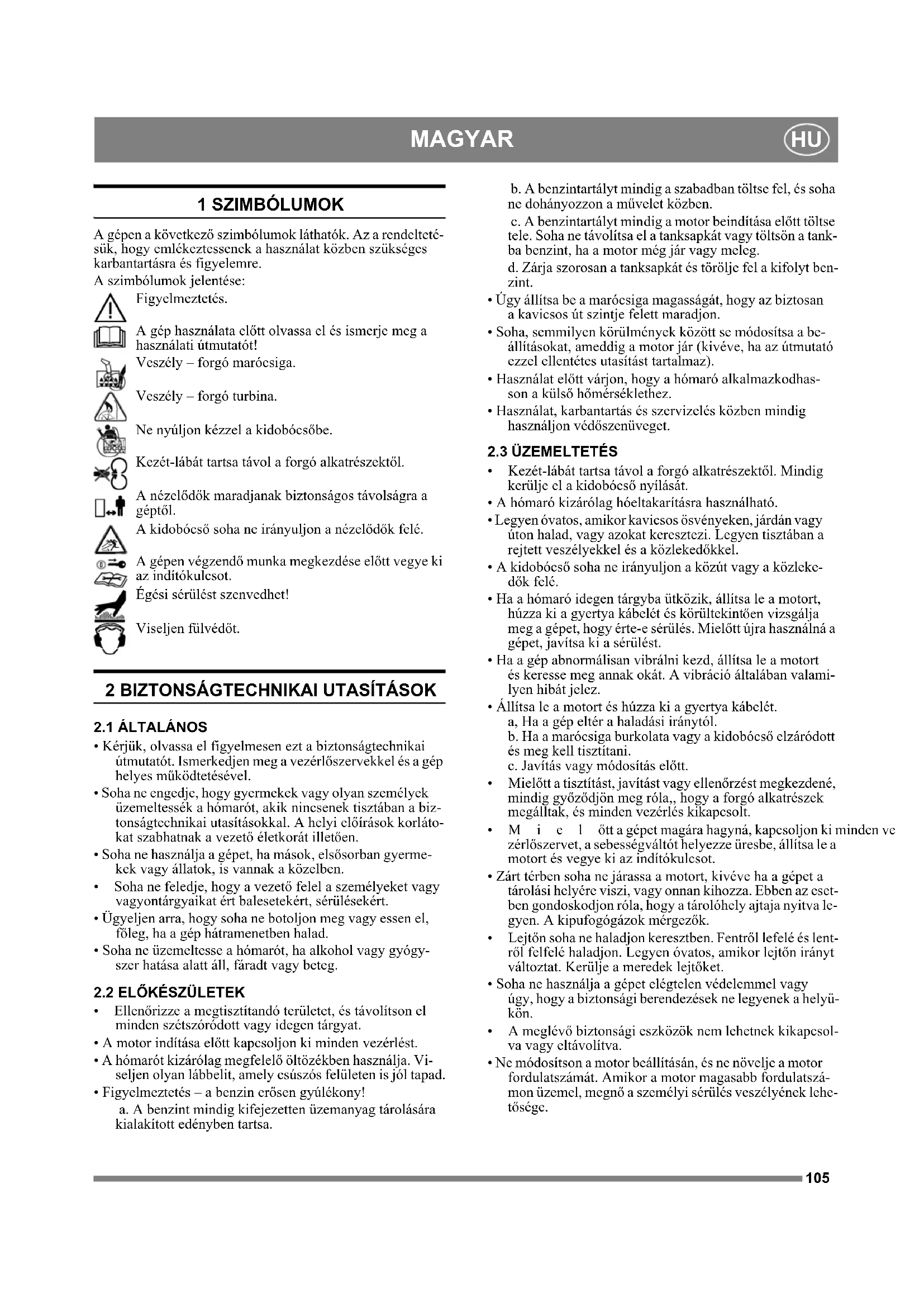 - Ne módosítson a motor beállításán, és ne növelje a motor fordulatszámát. Amikor a motor magasabb fordulatszá- mon üzemel, megnő a személyi sérülés veszélyének lehe- tősége.106 MAGYAR