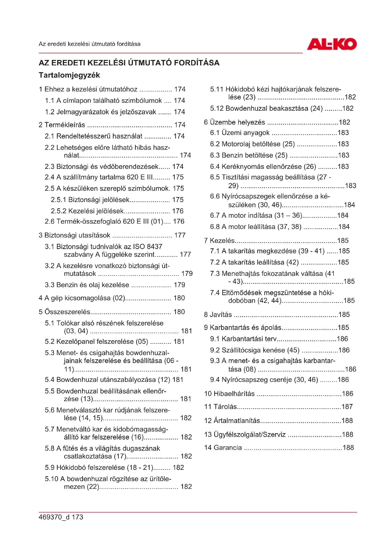 belső égésű motorokra (ezekre a motorgyártó cég garanciális rendelkezései érvényesek). A garancia az első végfelhasználó vásárlásától lép életbe. Az időpont meghatározásakor a fizetési bi- zonylaton szereplő dátum a mérvadó. A garanciajeggyel és az eredeti fizetési bizonylattal forduljon a szakkereskedéshez vagy a legközelebbi hivatalos ügyfélszolgálathoz. A vevő eladóval szembeni kel- lékszavatossági jogainak törvényes érvényesítési lehetőségeit a jelen nyilatkozat nem befolyásolja.469370_d 189 Oversættelse af den originale brugsanvisning