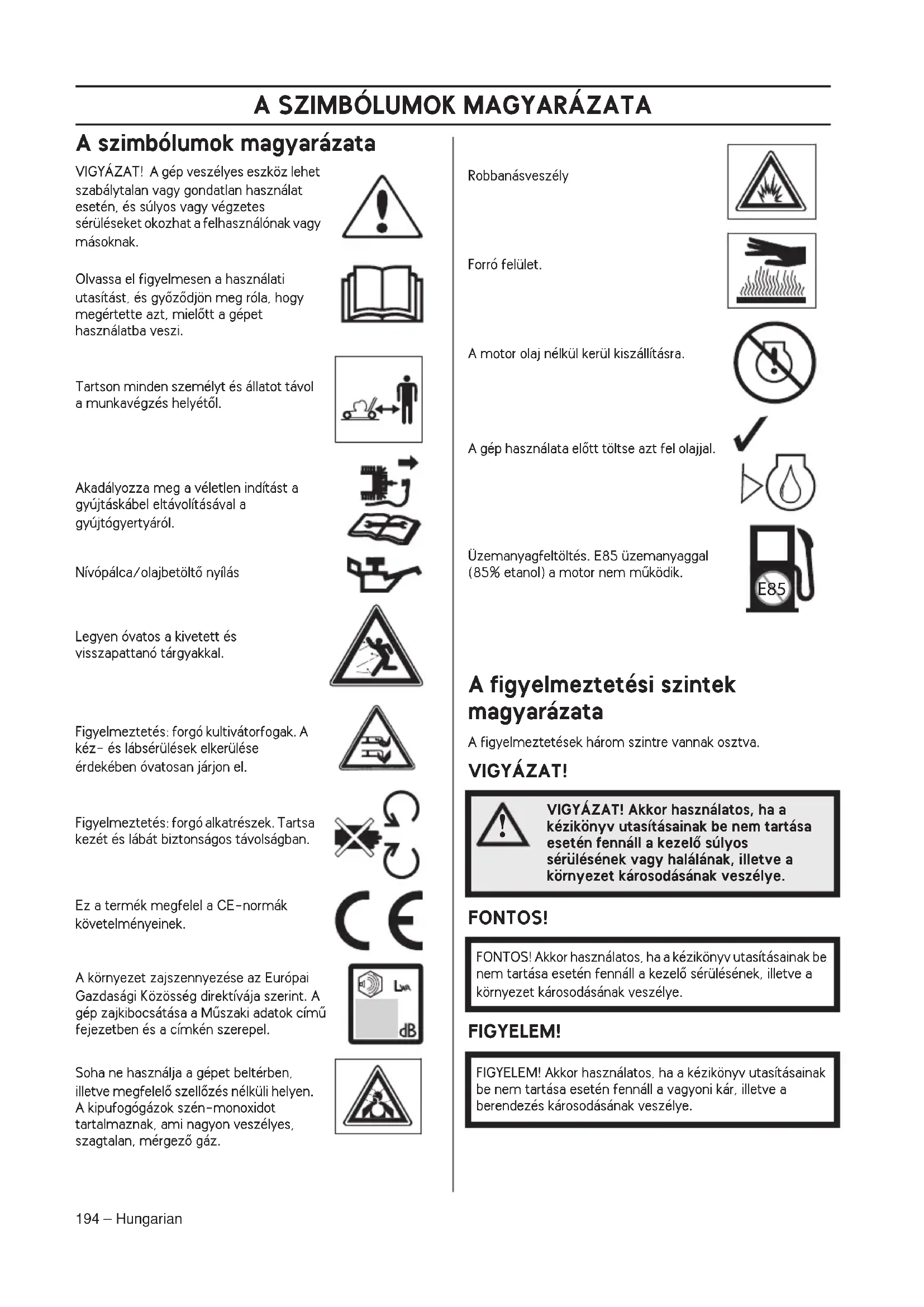 A szimbólumok magyarázata ..................................... 194 A figyelmeztetési szintek magyarázata ...................... 194