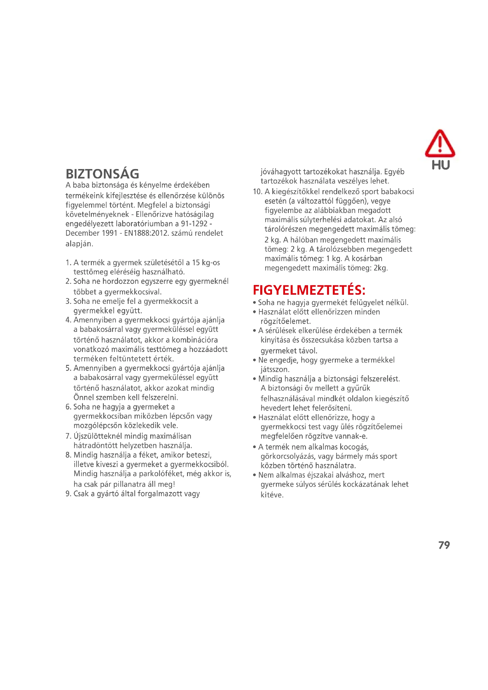 BIZTONSÁG A baba biztonsága és kényelme érdekében termékeink kifejlesztése és ellenőrzése különös figyelemmel történt. Megfelel a biztonsági követelményeknek - Ellenőrizve hatóságilag engedélyezett laboratóriumban a 91-1292 - December 1991 - EN1888:2012. számú rendelet alapján.