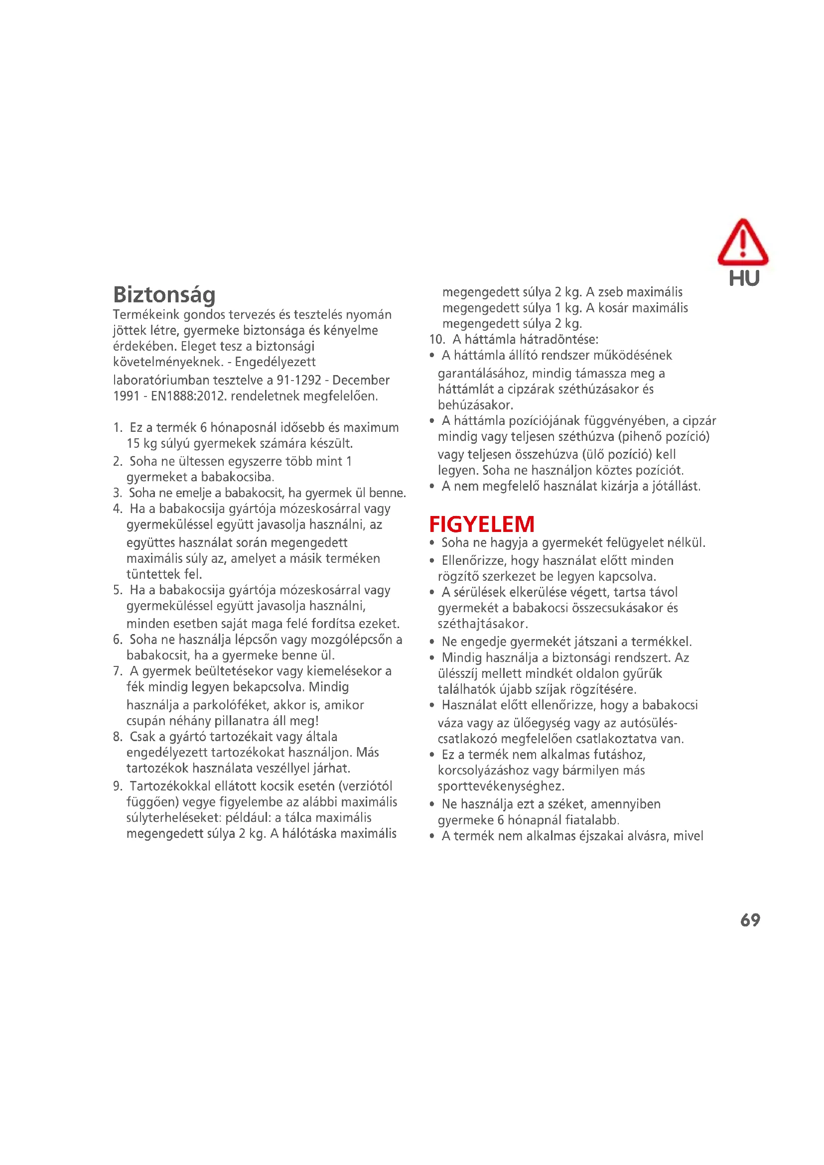 Biztonság Termékeink gondos tervezés és tesztelés nyomán jöttek létre, gyermeke biztonsága és kényelme érdekében. Eleget tesz a biztonsági követelményeknek. - Engedélyezett laboratóriumban tesztelve a 91-1292 - December 1991 - EN1888:2012. rendeletnek megfelelően.